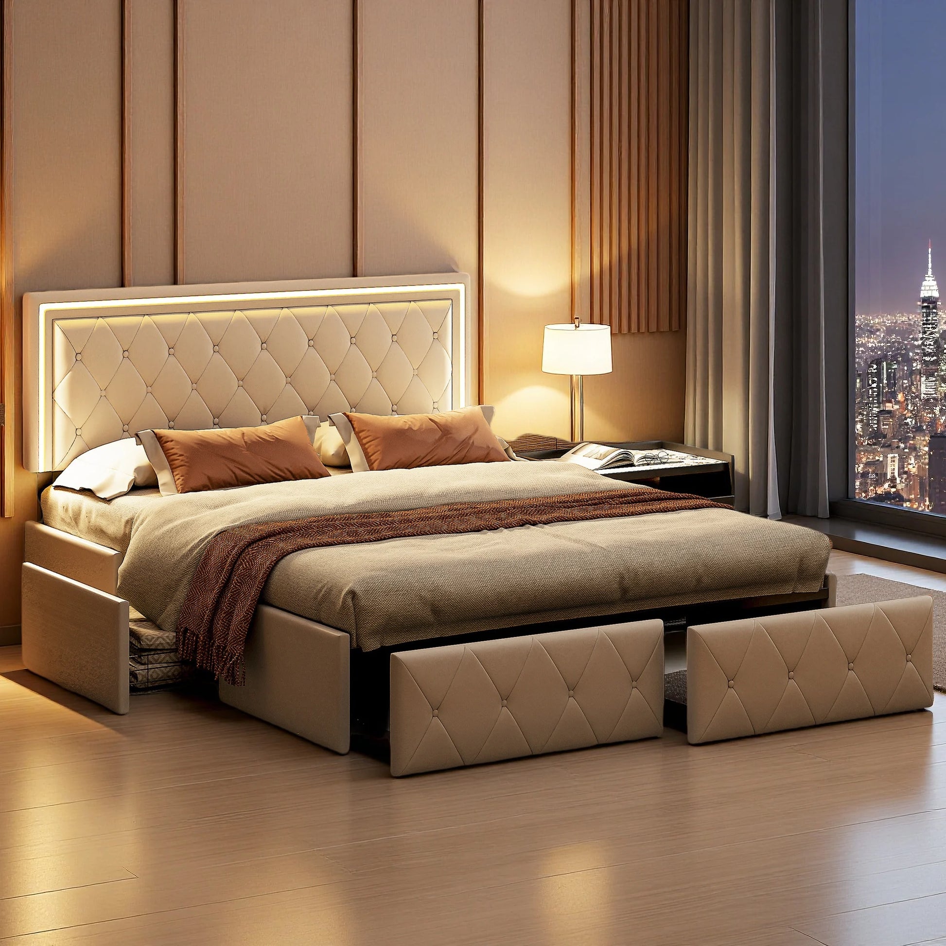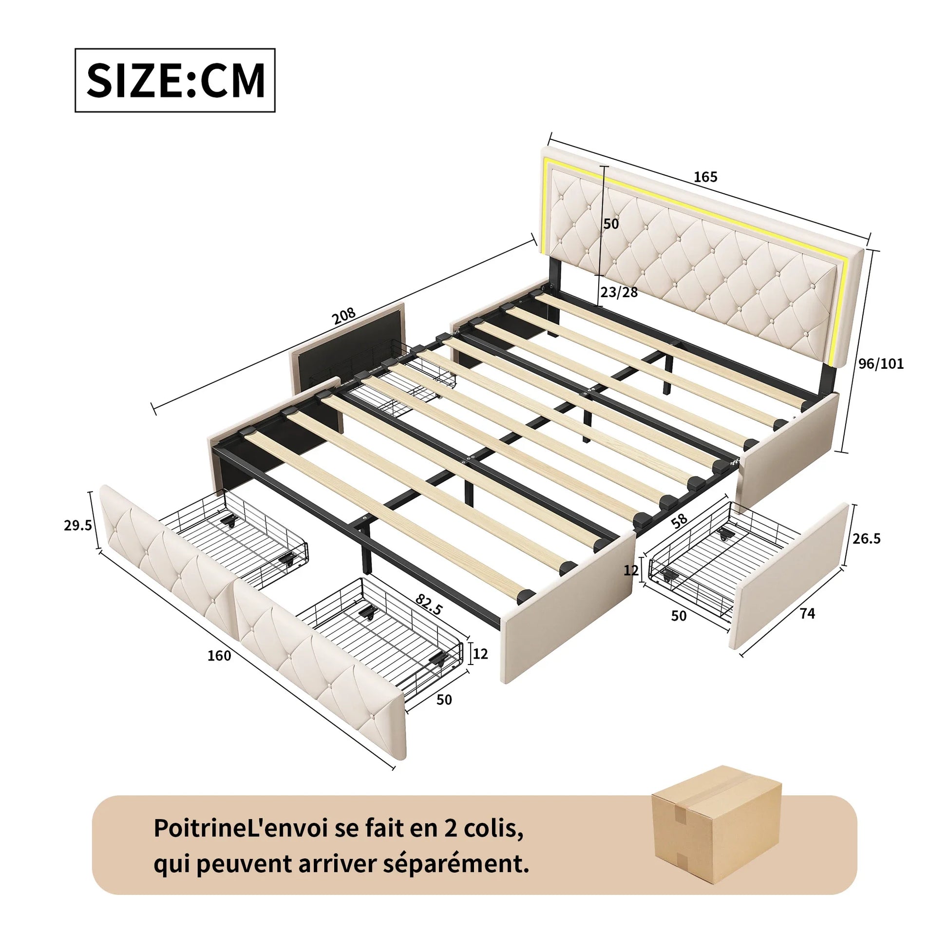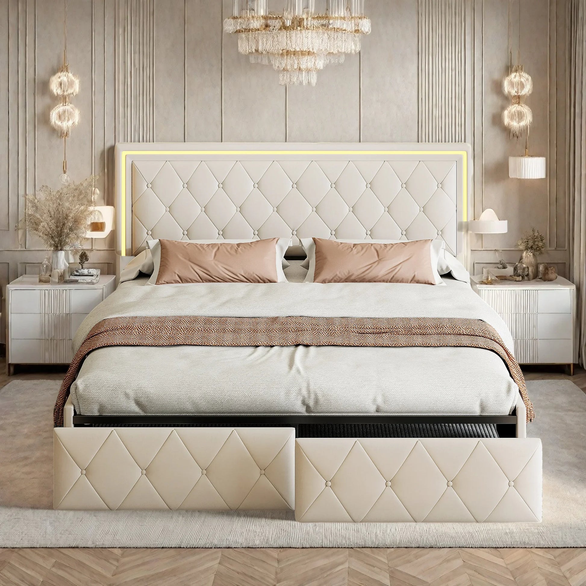 Rosahqnda Modernes Kunstlederbett mit Schubladen, stilvolles Doppelbett aus Kunstleder mit Stauraum, ohne Matratze