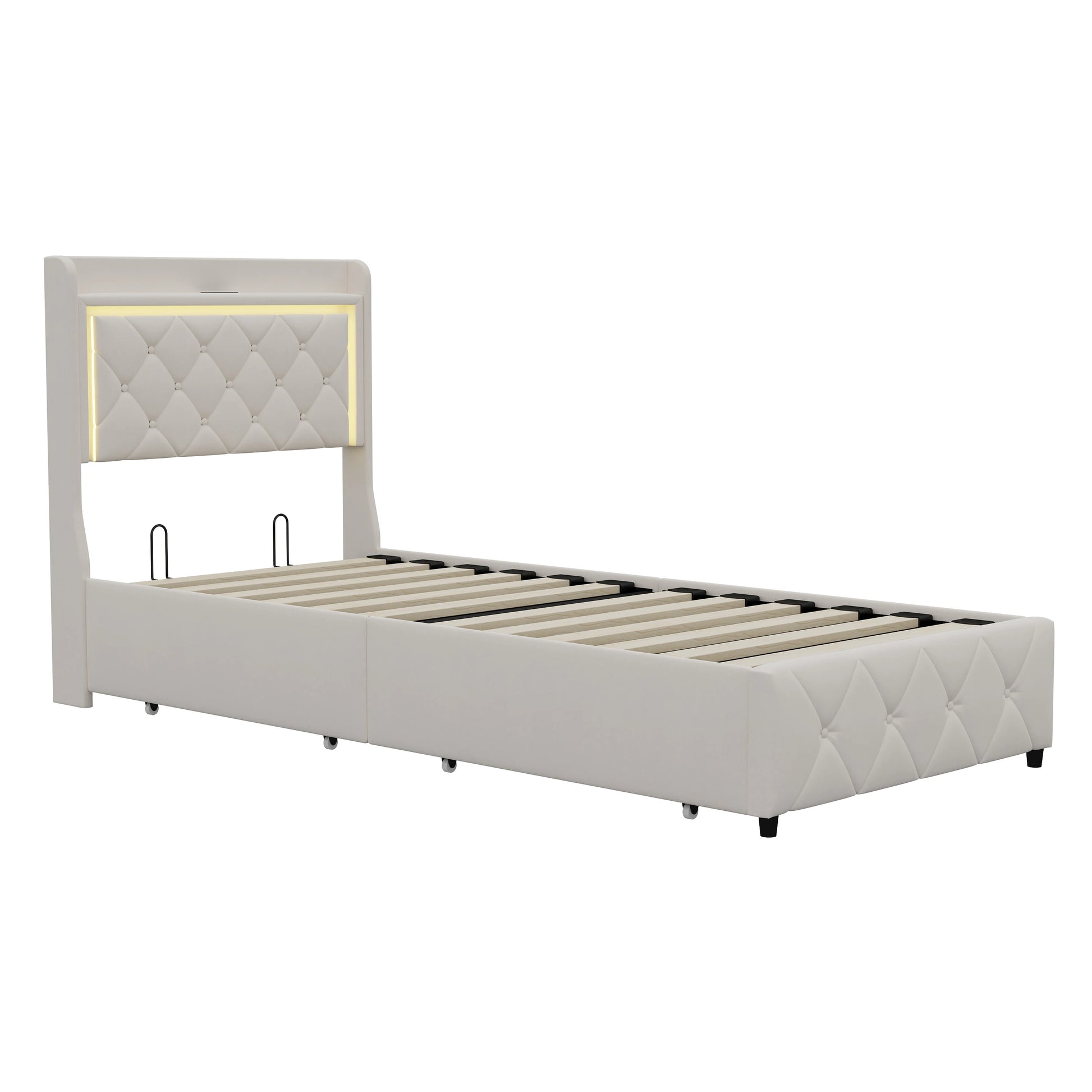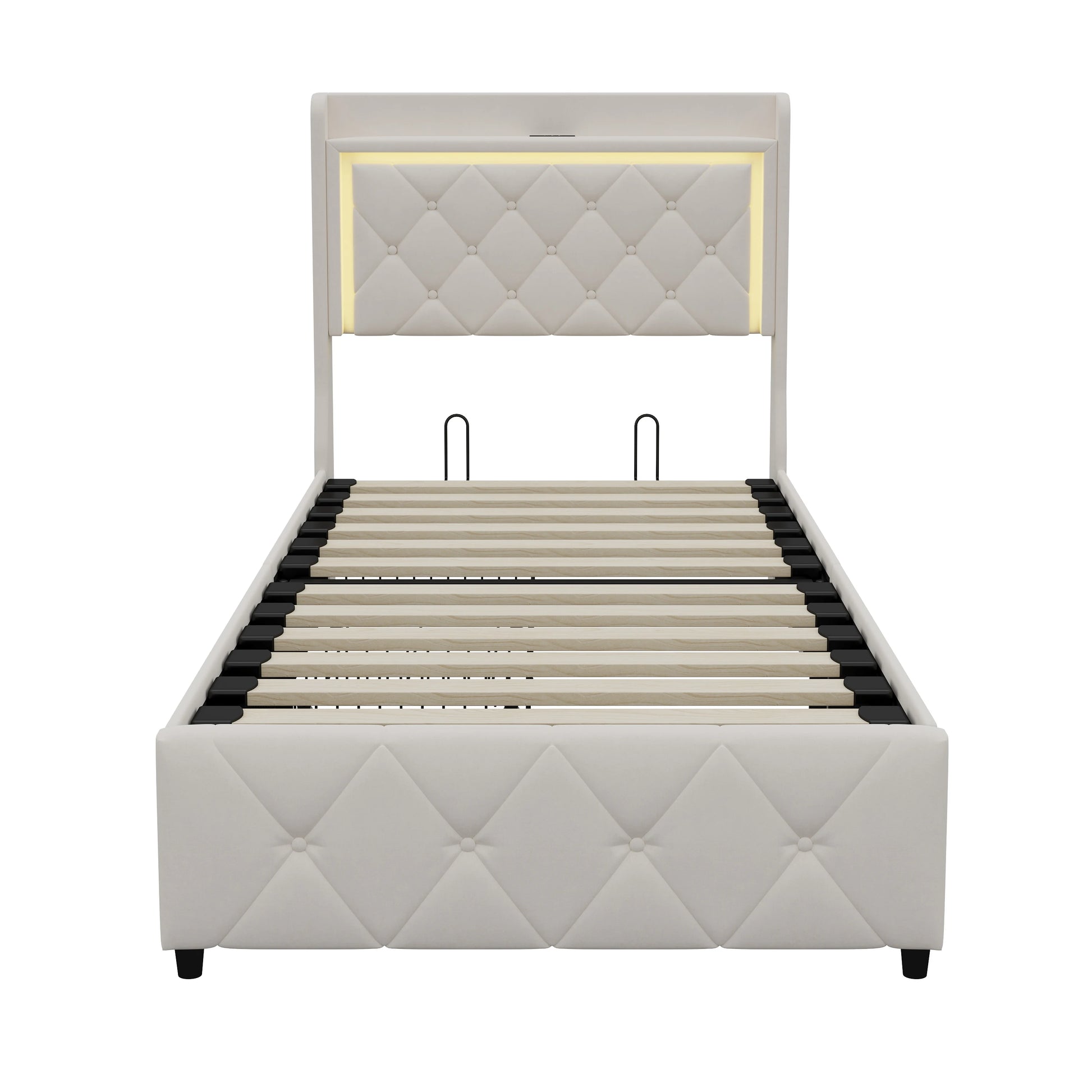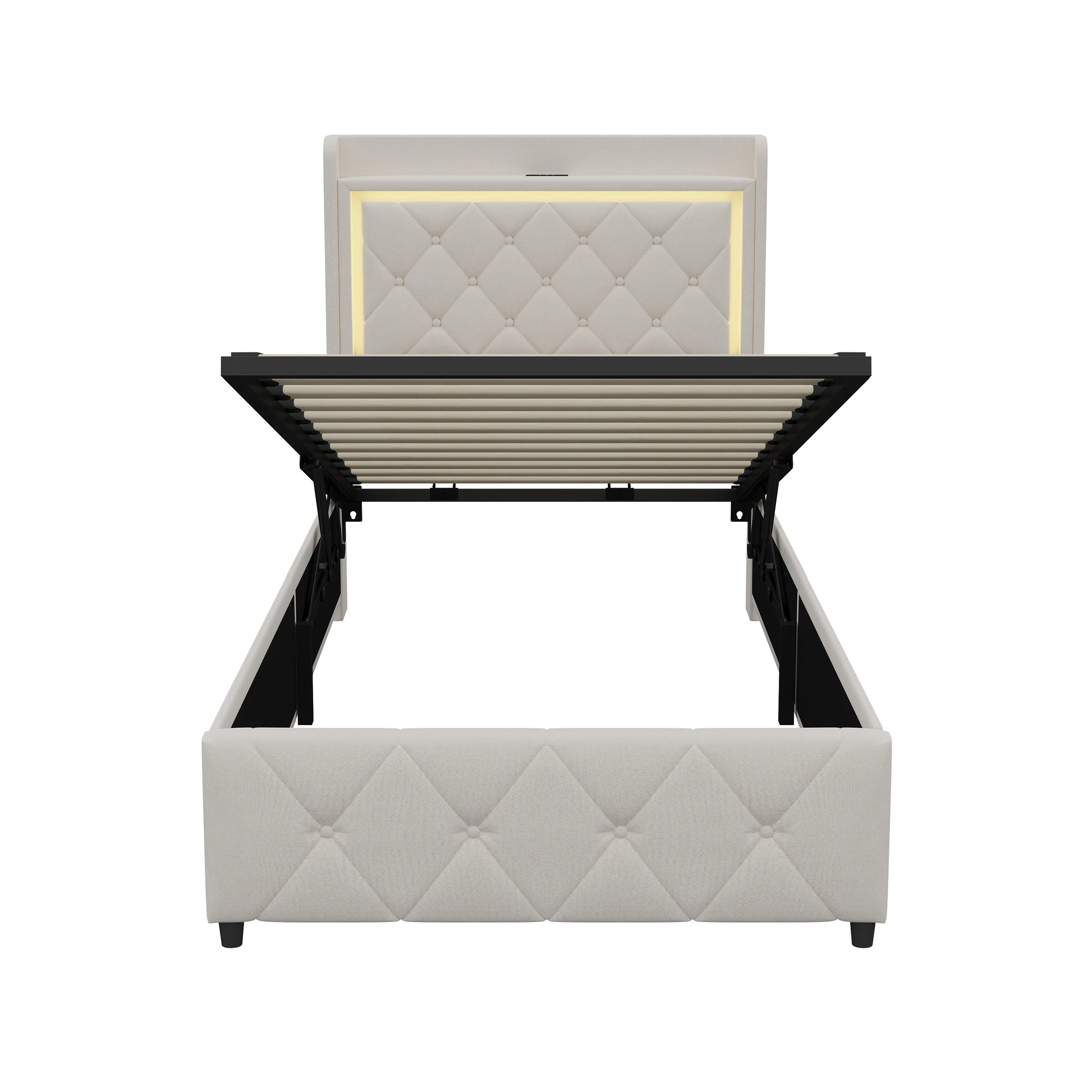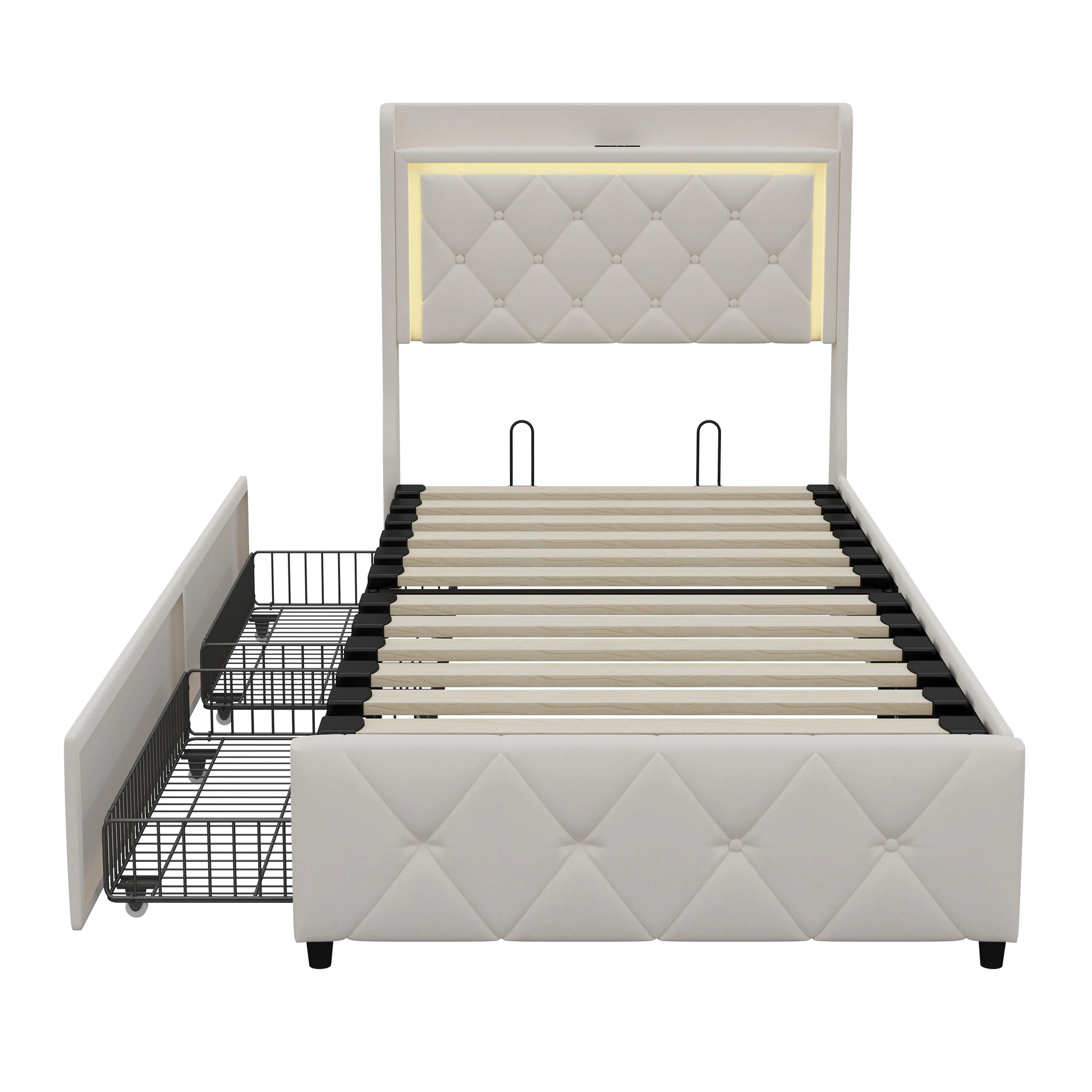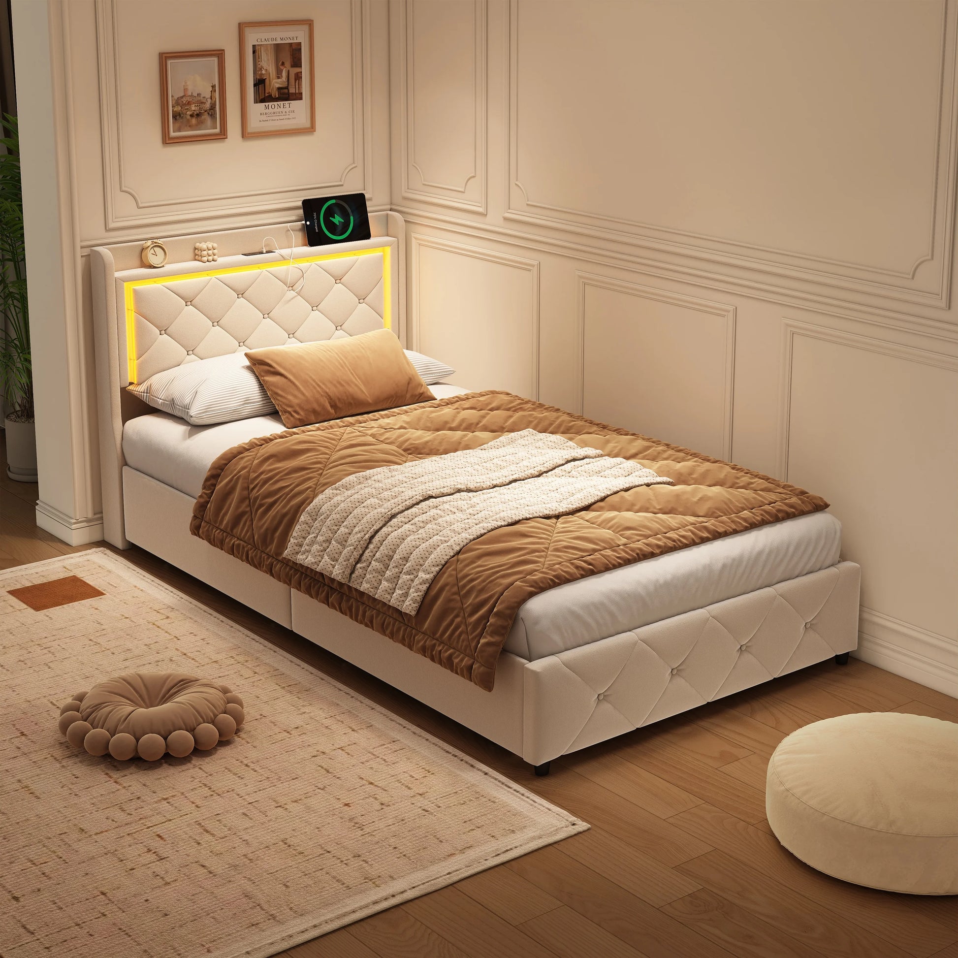 Rosahqnda Polster-Einzelbett 90 x 200 cm mit LED, Jugendbett mit USB/Typ-C, Bettkasten, Holzrahmen, Flanell (ohne Matratze)