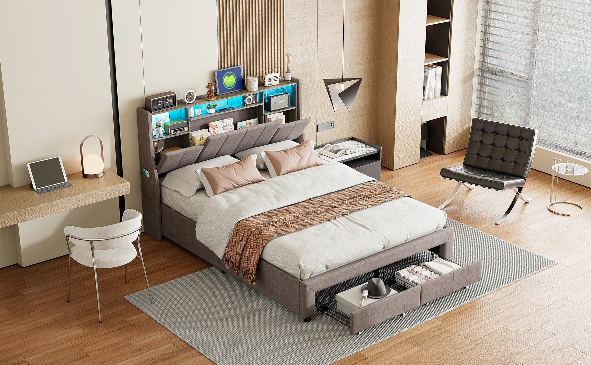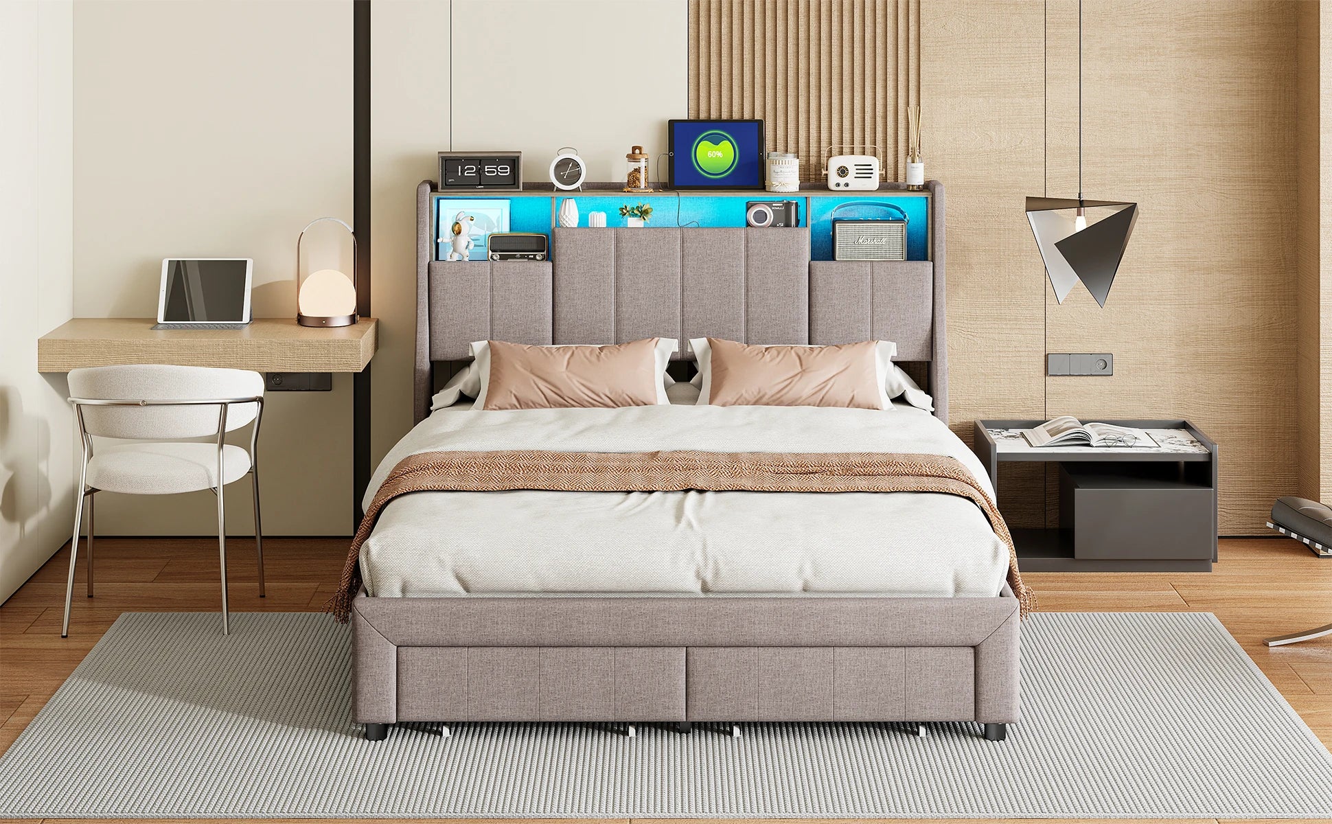 Rosahqnda Polsterbett 140/160 x 200 cm mit LED, USB, Schubladen, Kopfteil mit Stauraum, Gästebett, Wohnmännerbett, Leinen für Erwachsene/Teenager,