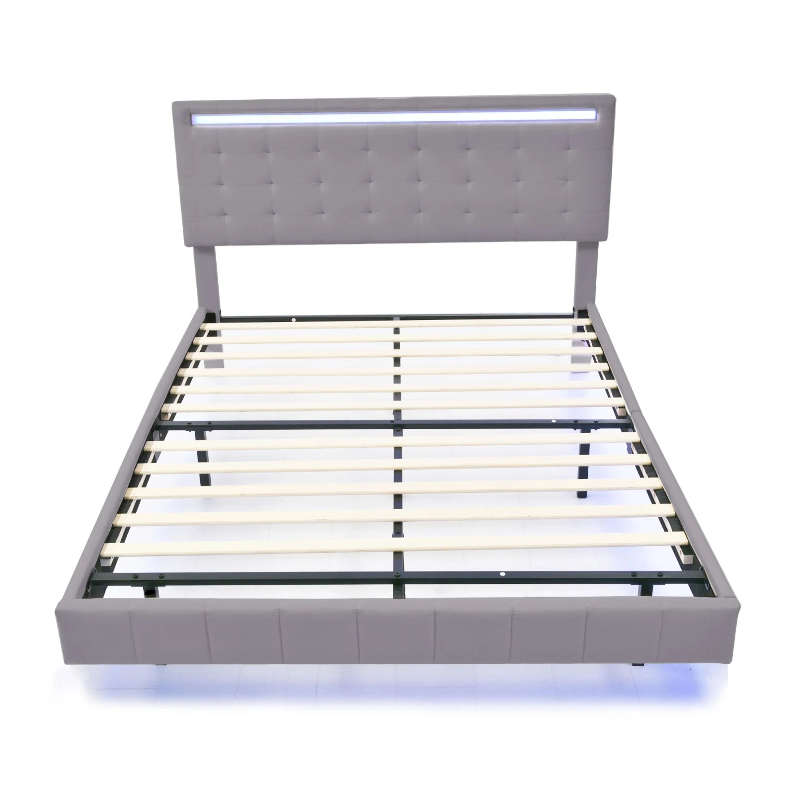 Rosahqnda Polsterbett 140/160x200cm, Doppelbett mit LED, 2 USB, schwebender Bettrahmen, Holzlattenrost, graues Leinen