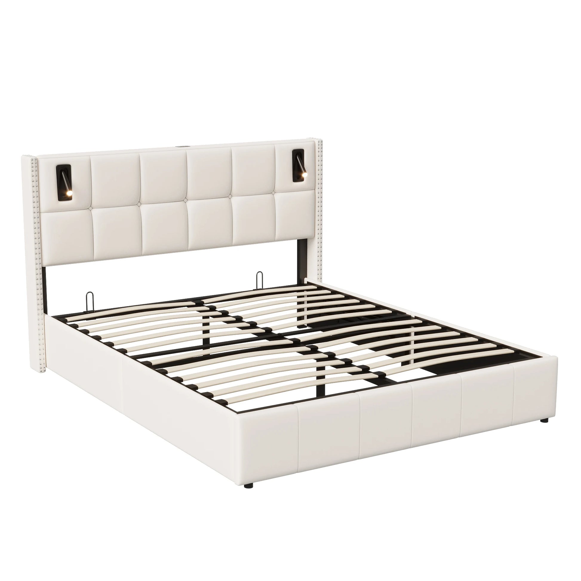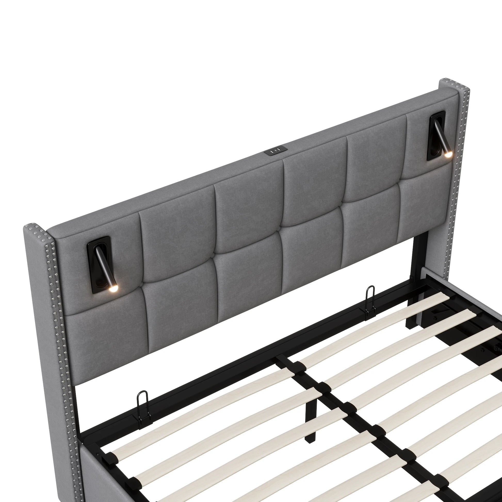 Rosahqnda Polsterbett 160x200 cm mit Stauraum,Kopfteil mit LED-Leselicht,Kupfernieten Modernes Bettgestell,Grauer Samtstoff