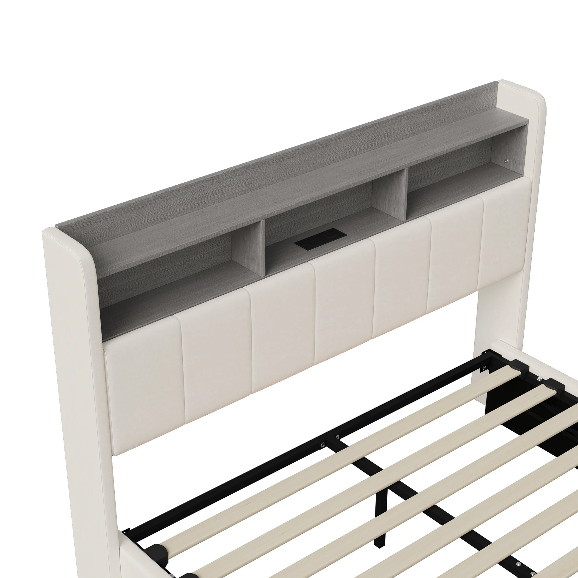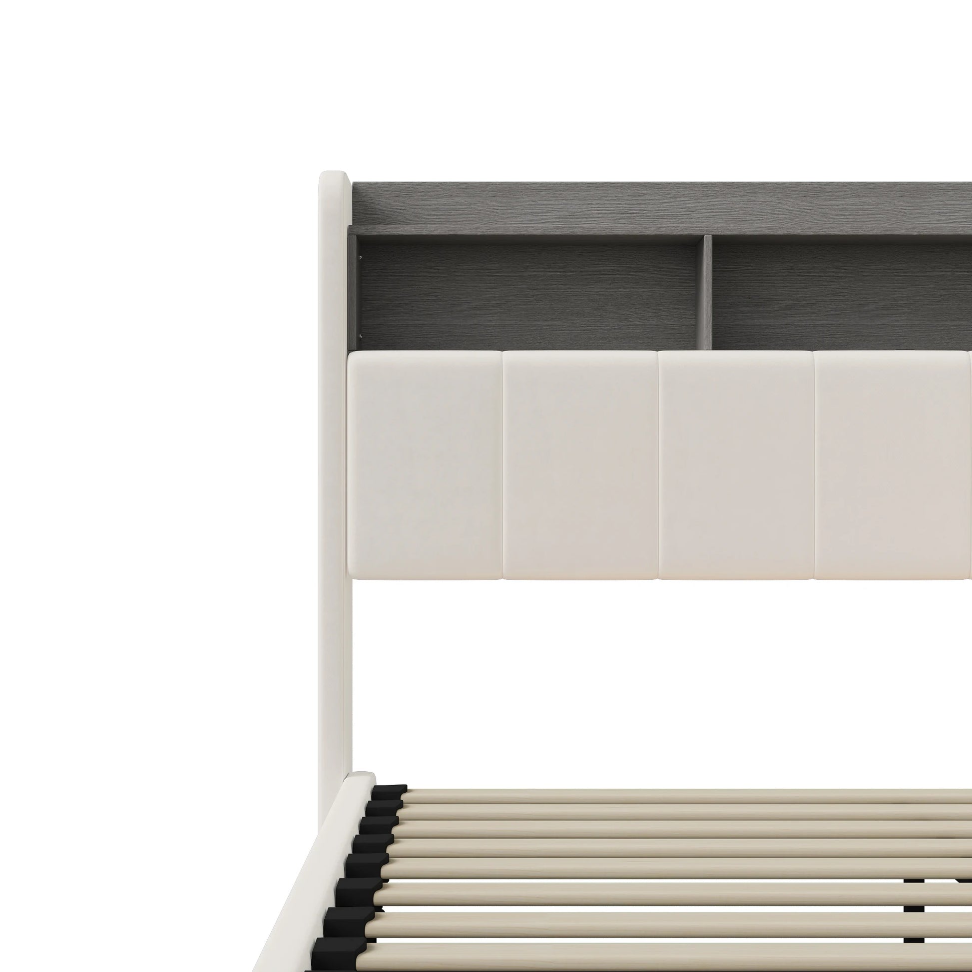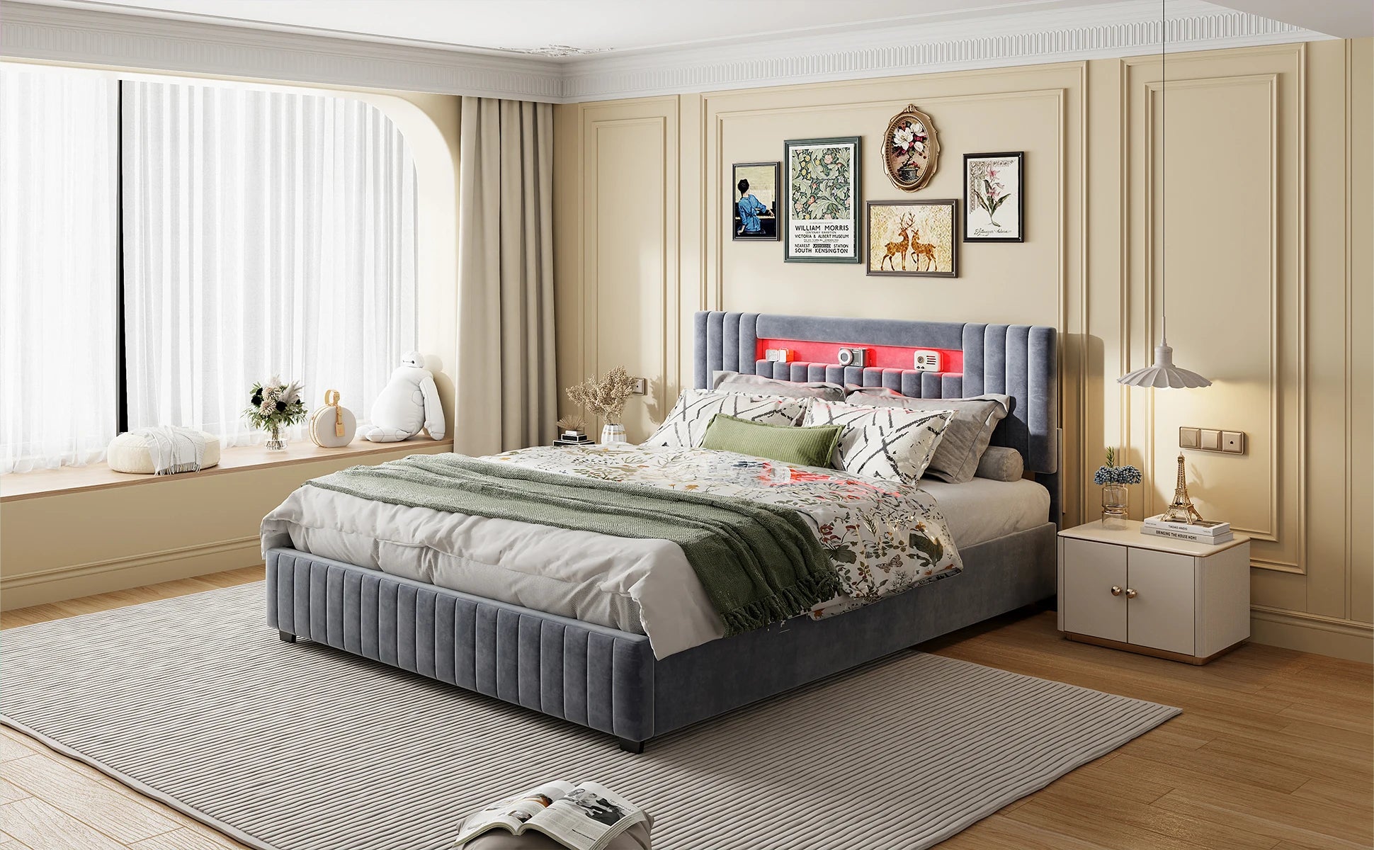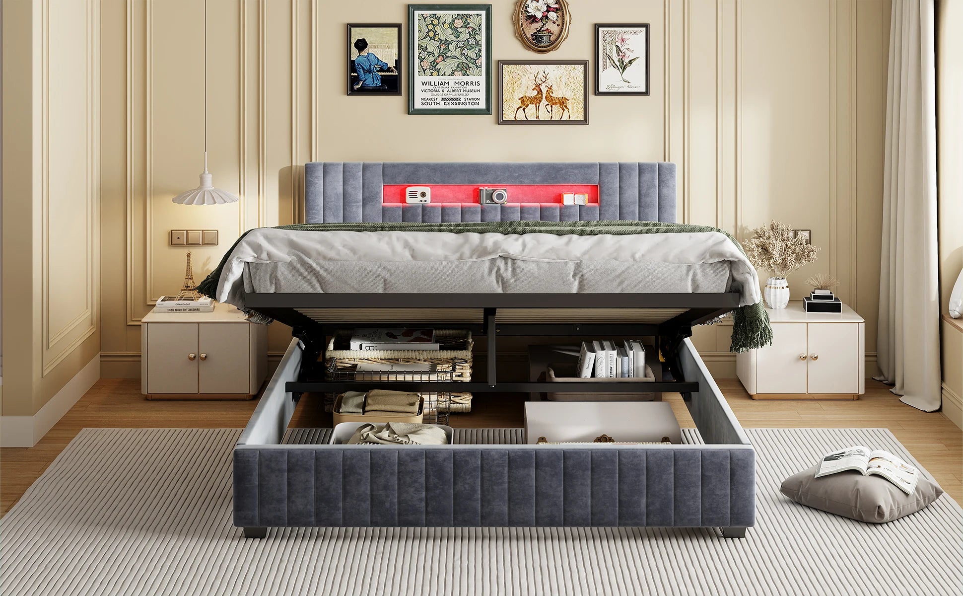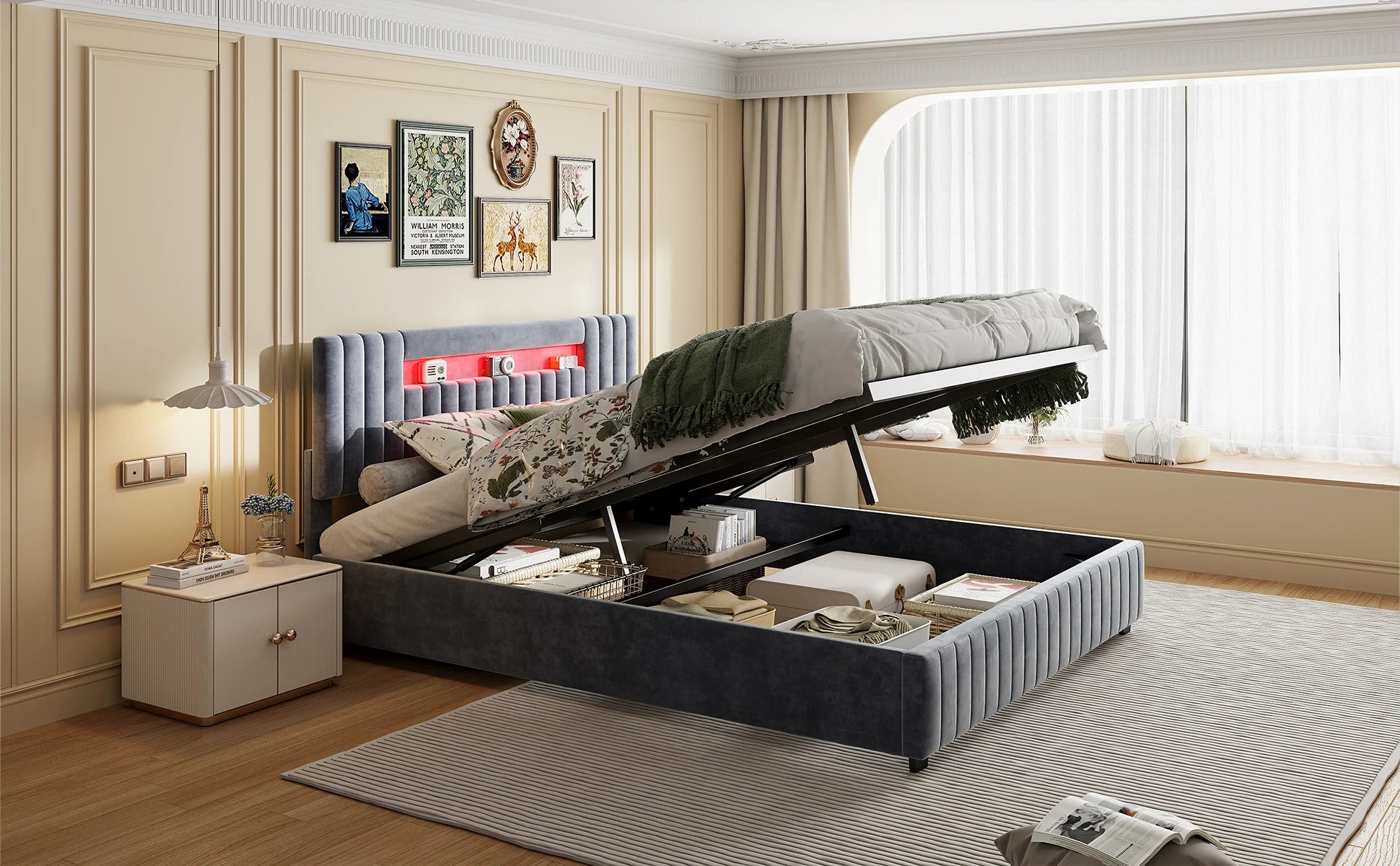 Rosahqnda Polsterbett, Hydraulisches Doppelbett mit LED-Lichtleiste und großem Stauraum, 140-160 x 200 cm, Weiß/Grau