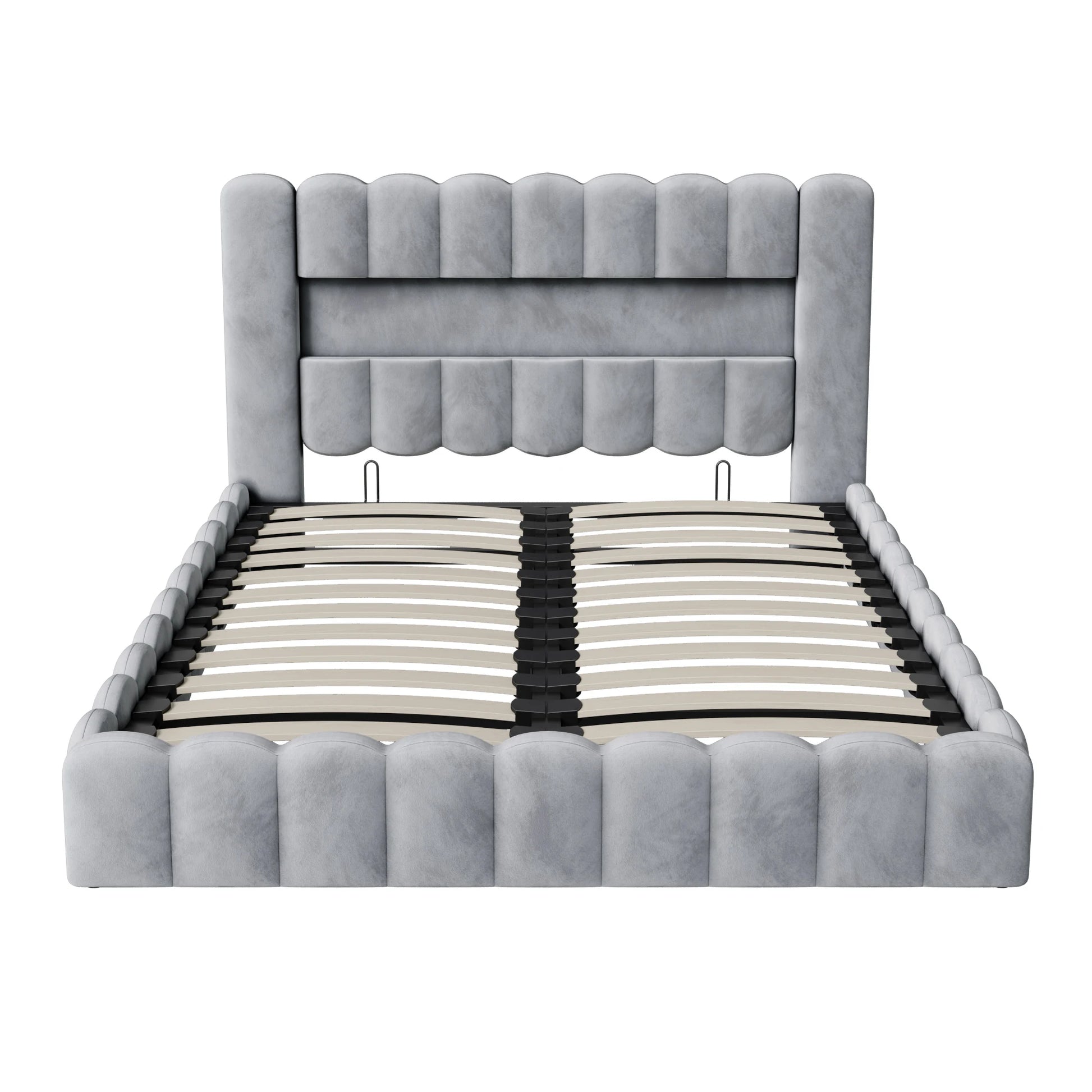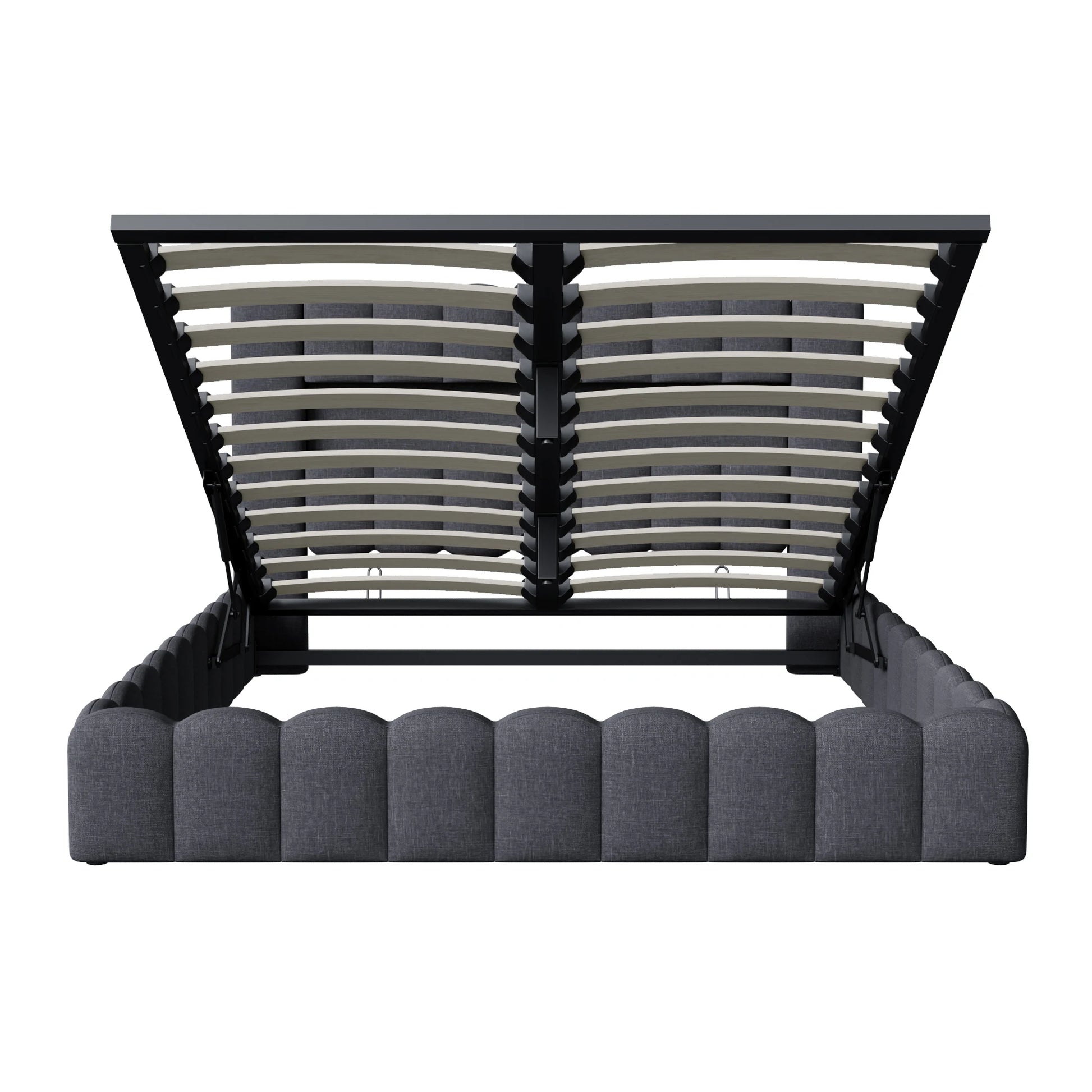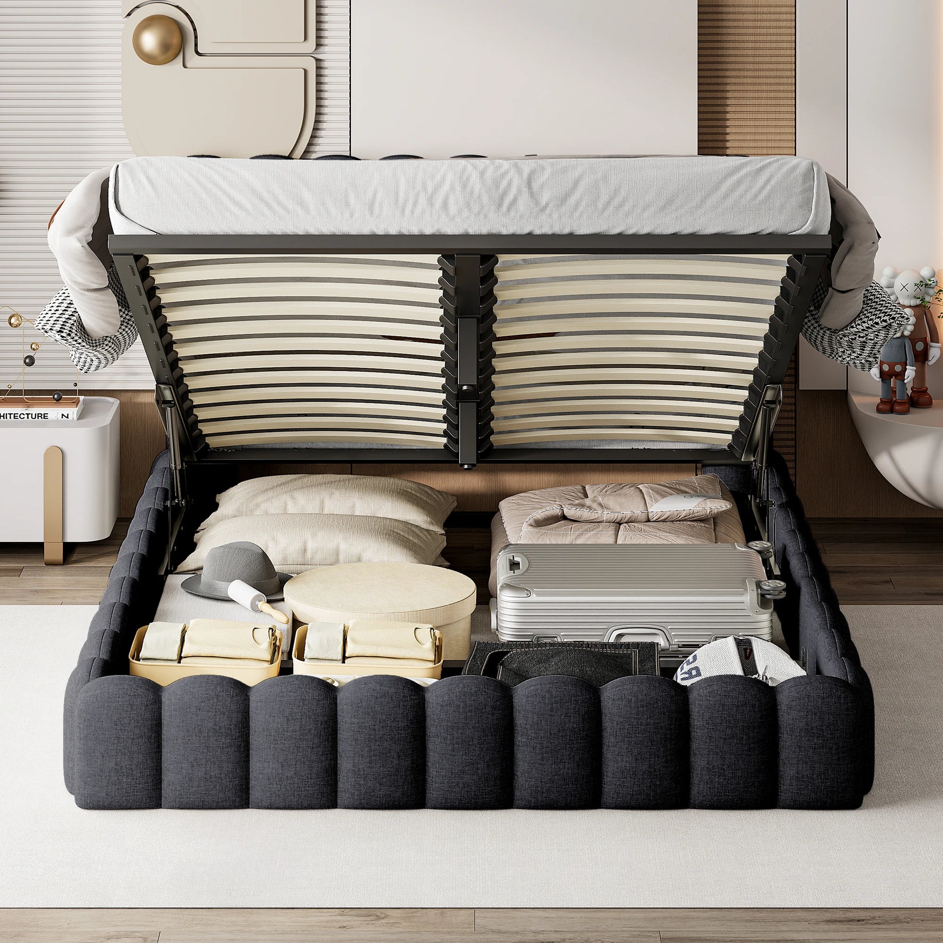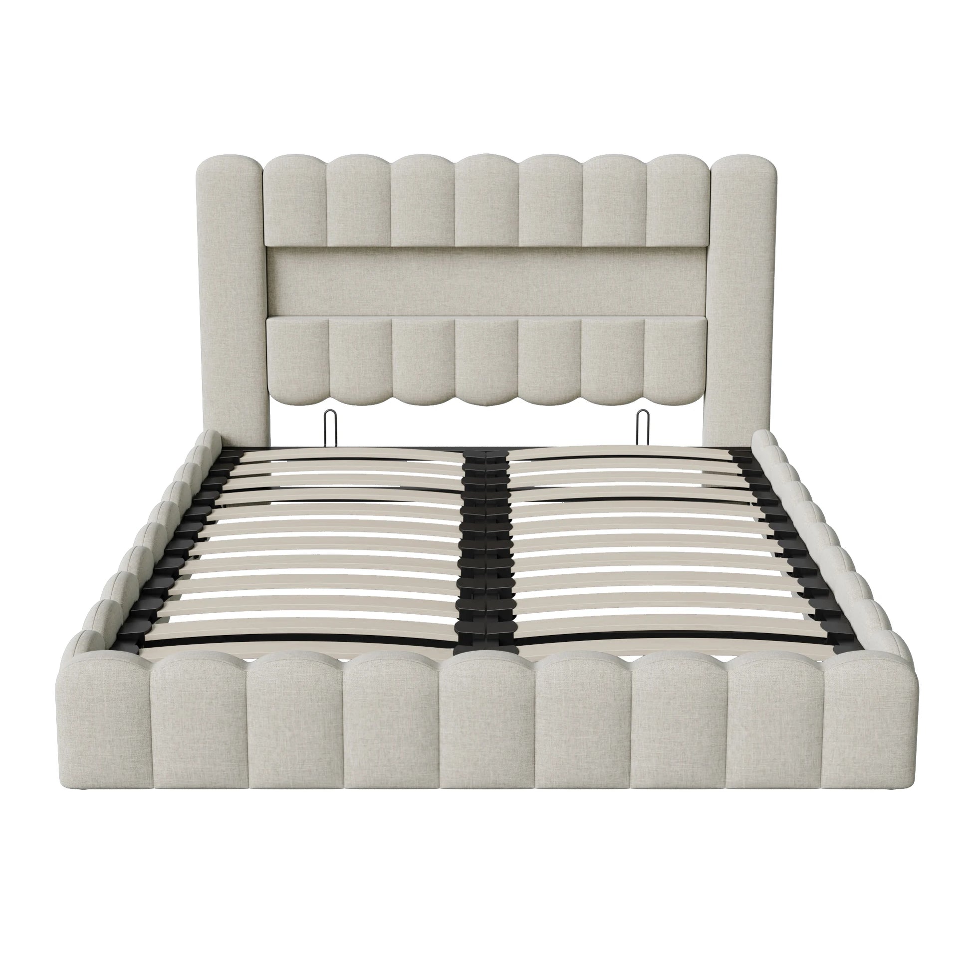 Rosahqnda Polsterbett mit LED- und USB-Anschluss, Leinenbaumstumpfbettgestell mit Kopfteil, 140 x 200 cm großes hydraulisches Bett ohne Matratze