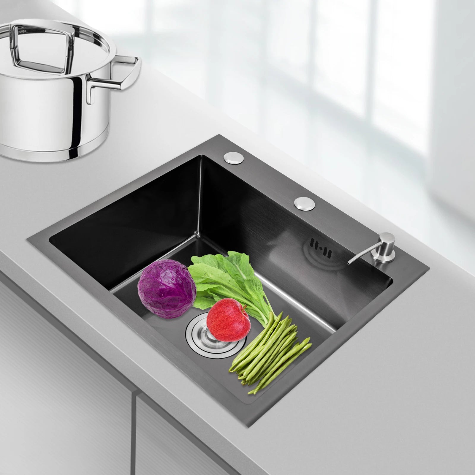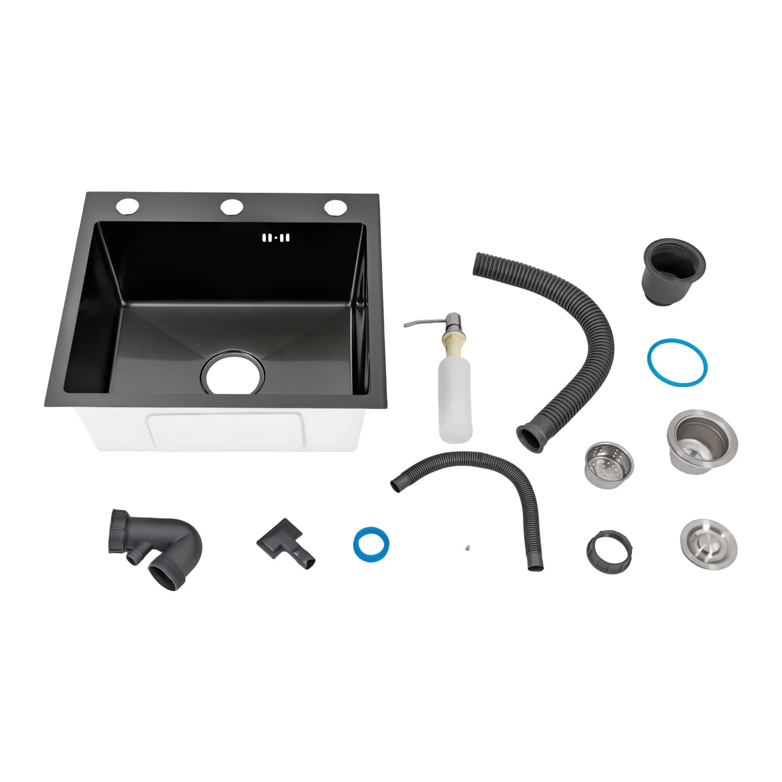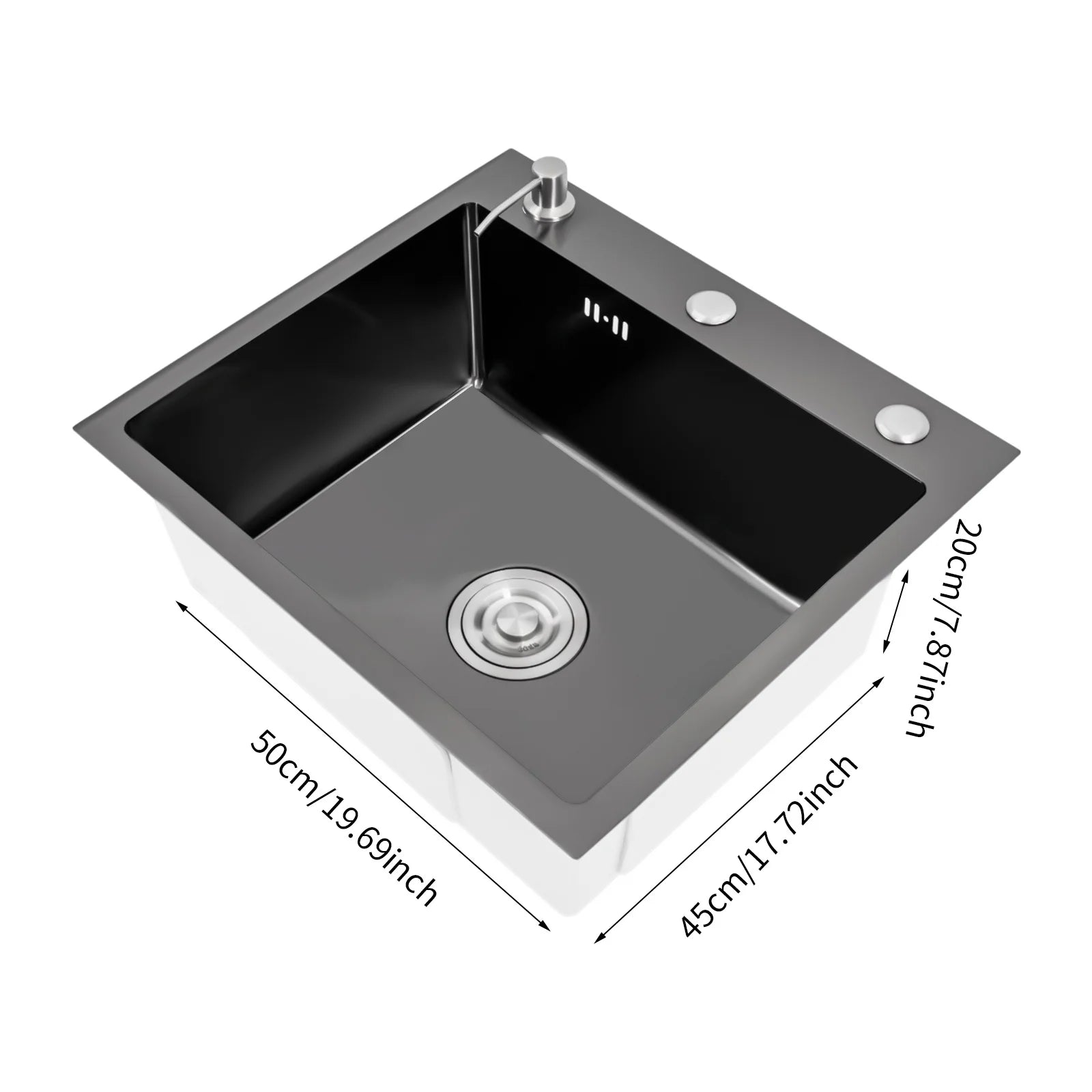 Schwarze Spüle, integrierte Spüle aus Edelstahl, Küchenspüle, Spüle mit Seifenspender und Wasserschlauch, 45 x 50 cm