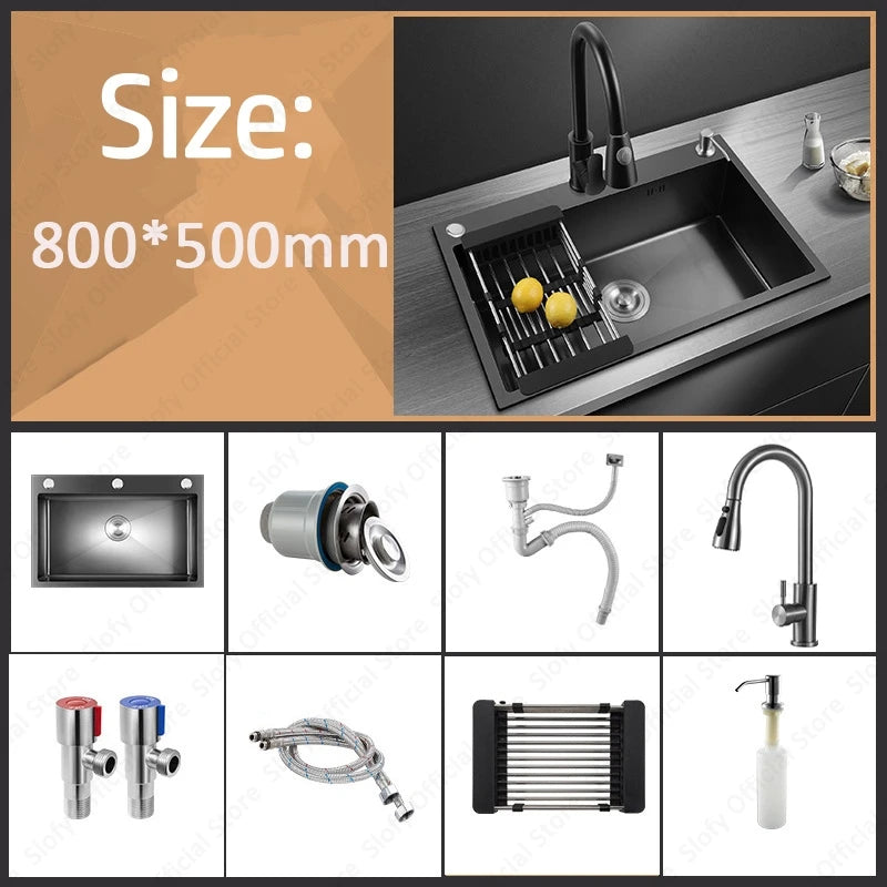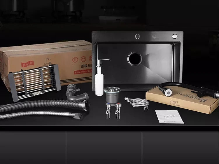 Schwarzes Nano-Waschbecken, einzelnes Waschbecken, kreative Küchenspülen aus Edelstahl, Abflussset für Zuhause, handgefertigtes Waschbecken, Küchenzubehör