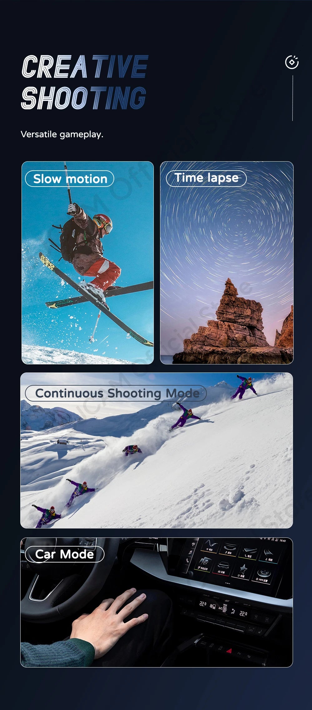 Video mode: Normal mode/Time-lapse/Slow video/Video+photo/Car mode/Vertical screen(9:16)/Loop video