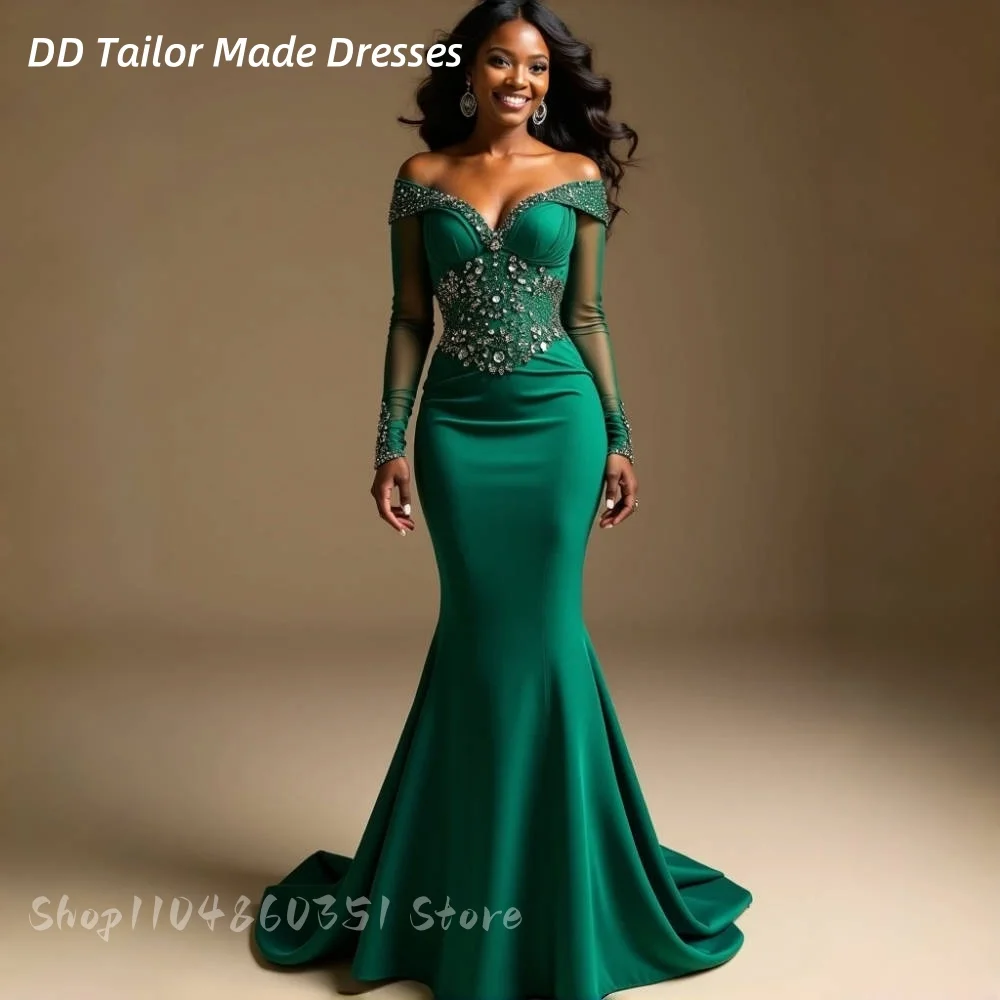 Smaragdgrünes Satin-Meerjungfrau-Abendkleid mit Kristallperlen, schulterfrei, lange Ärmel, schmales formelles Anlasskleid, maßgeschneiderte Abschlussballkleidung