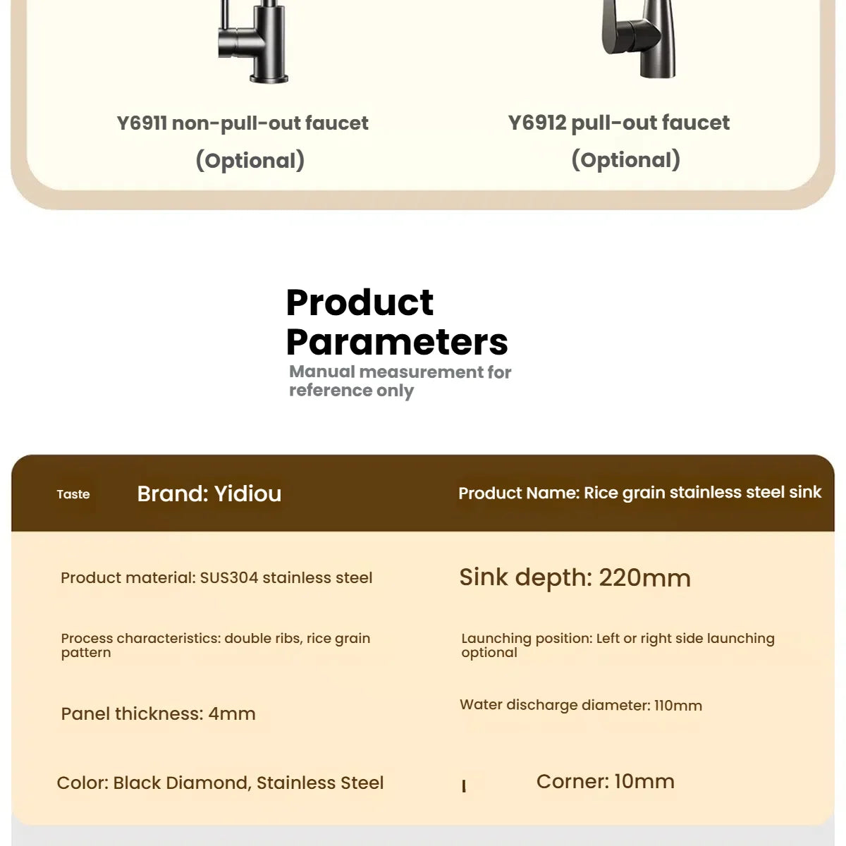 Stainless Steel Kitchen Sink Household Rice Grain Pattern Large Single Slot Wear Resistant Wash Dish Bowl Countertop Basin