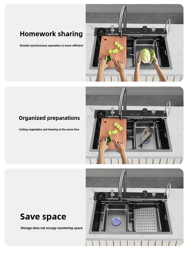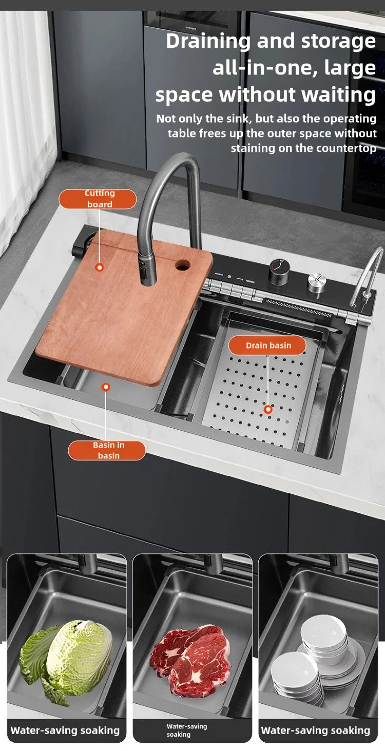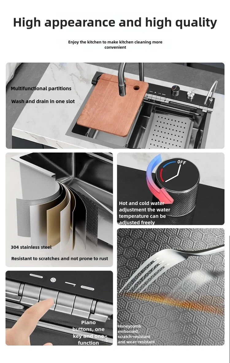 Stainless Steel Kitchen Sink Waterfall Faucet Large Single Sink Intelligent Dishwasher Sink Digital Display and Light Effects