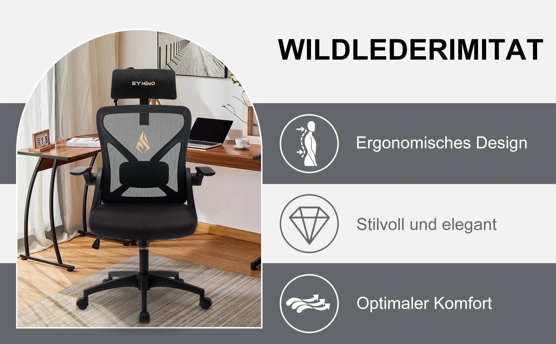 SYMINO Bürostuhl mit verstellbarer Kopfstütze, Armlehnen, Lordosenstütze, ergonomischer Bürostuhl, drehbarer Wippfunktion