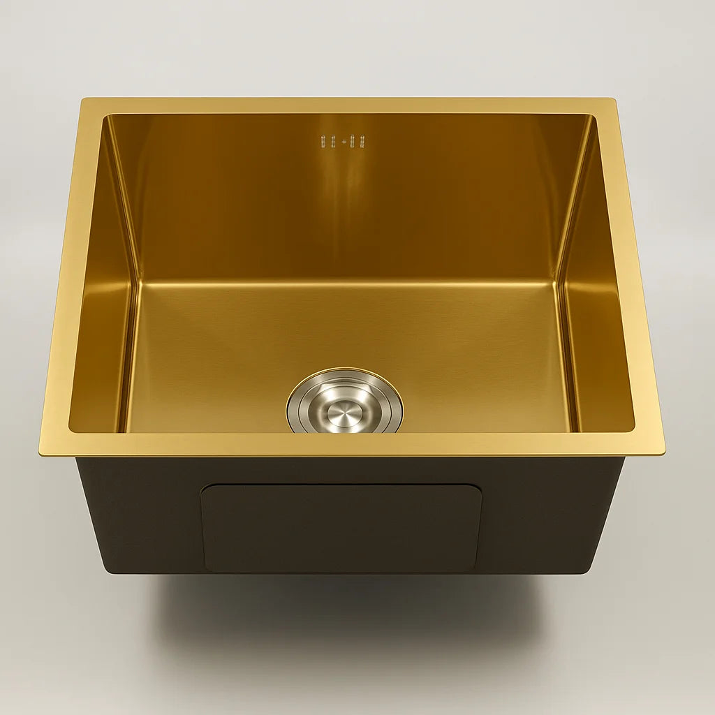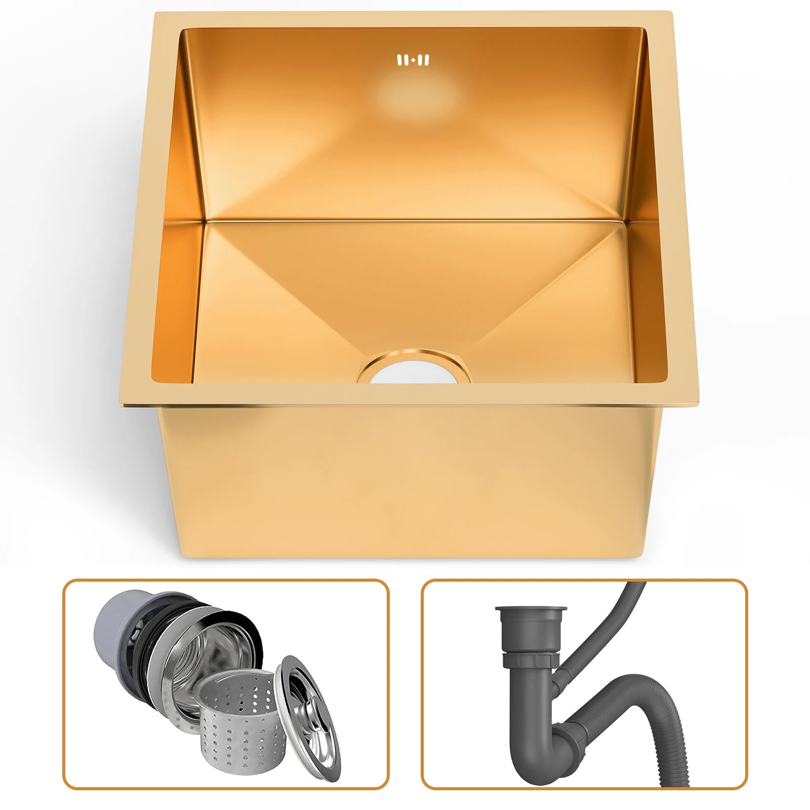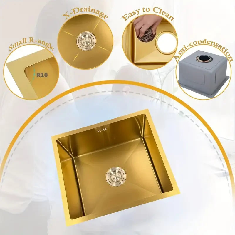 Unterbau-Küchenspüle aus Edelstahl mit abgerundeter Einzelschüssel, goldenes großes Spülbecken mit Abflussmontage