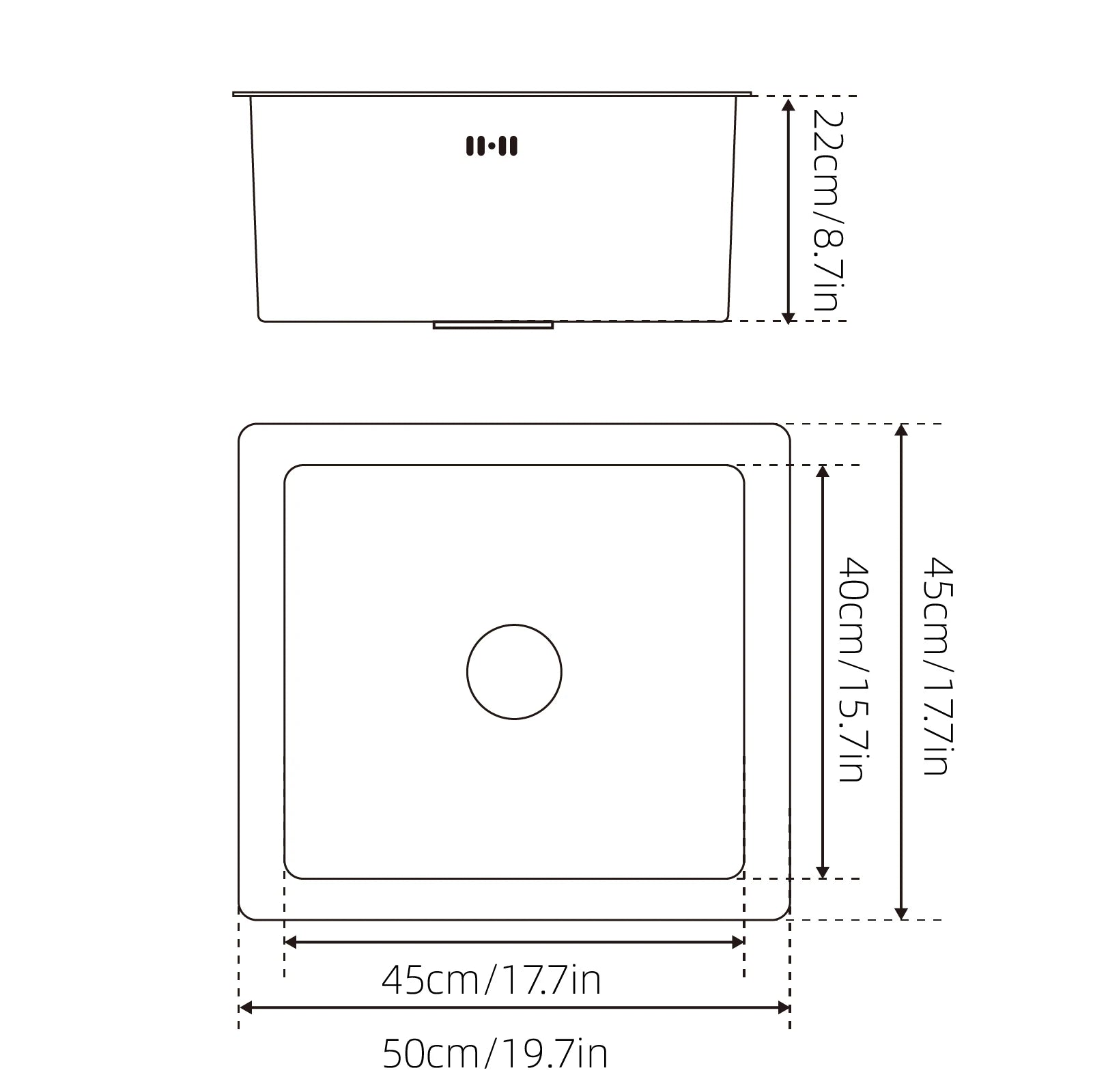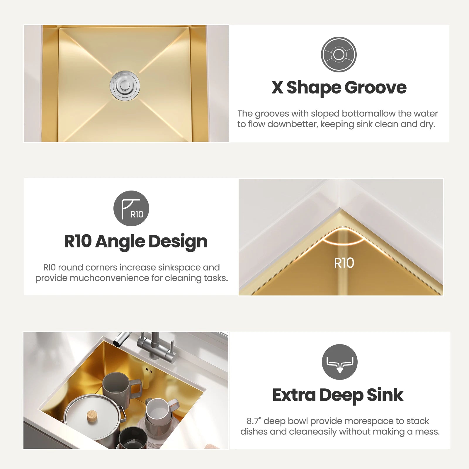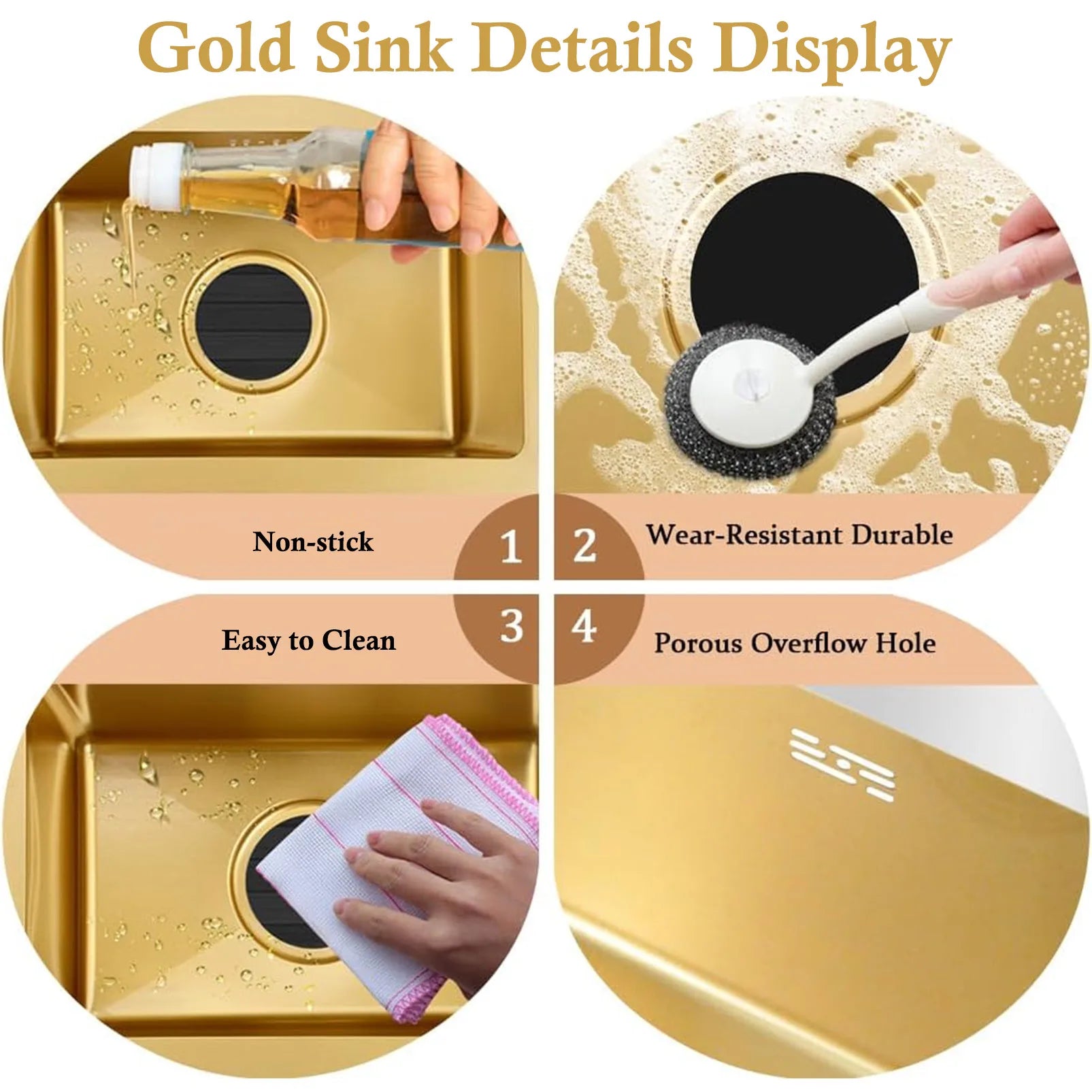 Unterbau-Küchenspüle aus Edelstahl mit abgerundeter Einzelschüssel, goldenes großes Spülbecken mit Abflussmontage