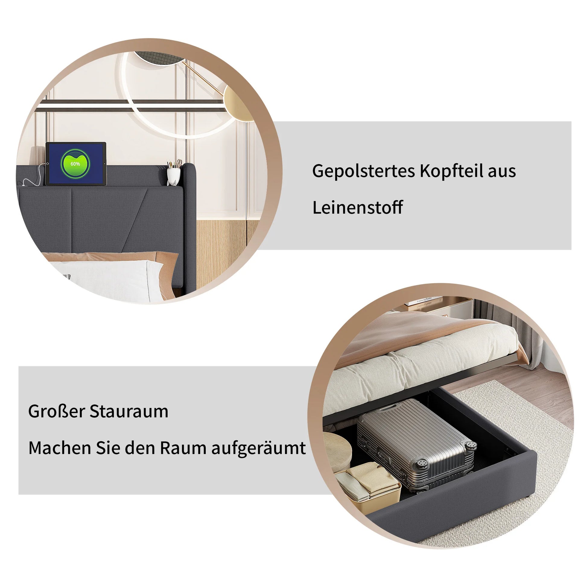 UrbanLuxe 160 x 200 cm Bett mit Stauraum, 2 USB-Anschlüsse + 1 Typ-C-Anschluss, Lattenrost, Leinen, grau, ohne Matratze