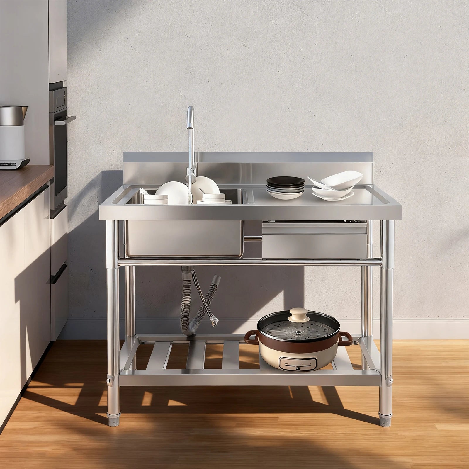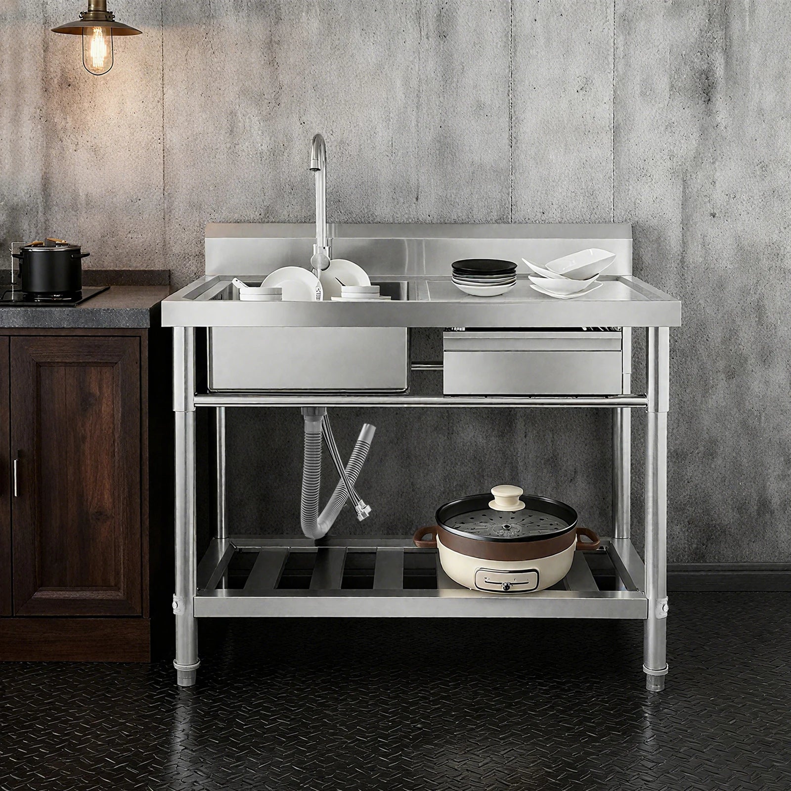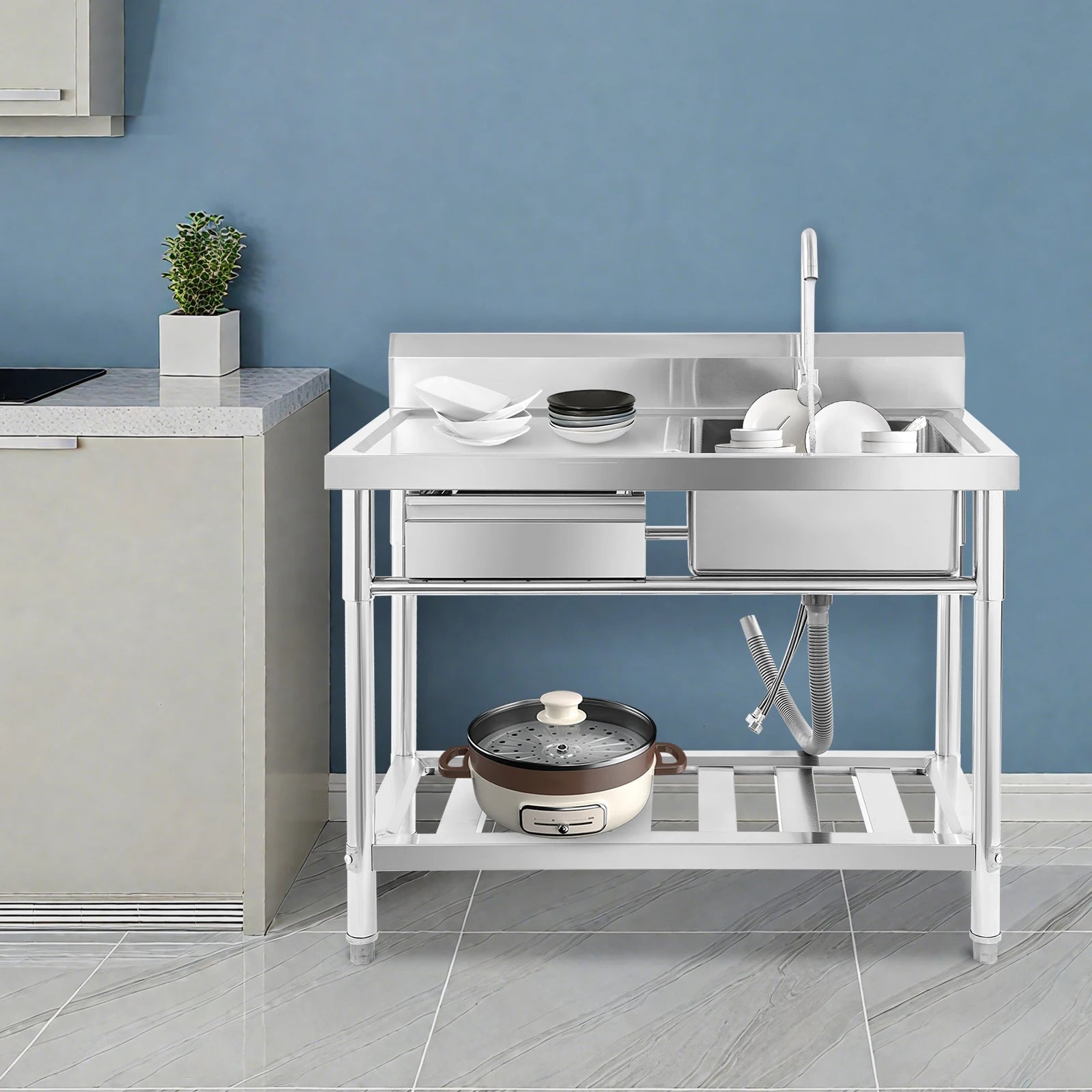 Verdicktes Edelstahl-Spülbecken mit Wasserhahn und Schublade, 150 kg Tragkraft 100 x 60 x 80 cm, für Küche, Restaurant, Wäsche, Garage