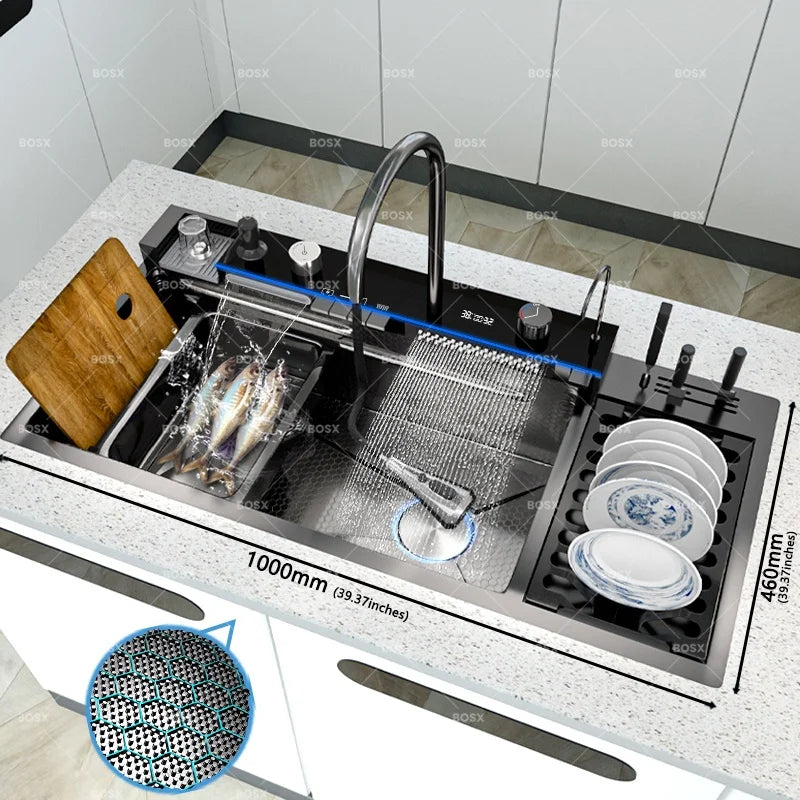 Wasserfall-Edelstahl-Küchenspüle, multifunktionale Digitalanzeige, Wasserhahn, Waschbecken und Gemüsebecken, großer Einzelschlitz