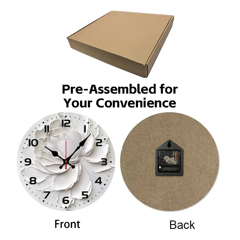 Weiße Pfingstrosen-Holzuhr, rund, geräuschlos, zum Aufhängen, geeignet für Wohnzimmer, Büro, Arbeitszimmer, Schlafzimmer, Heimdekoration