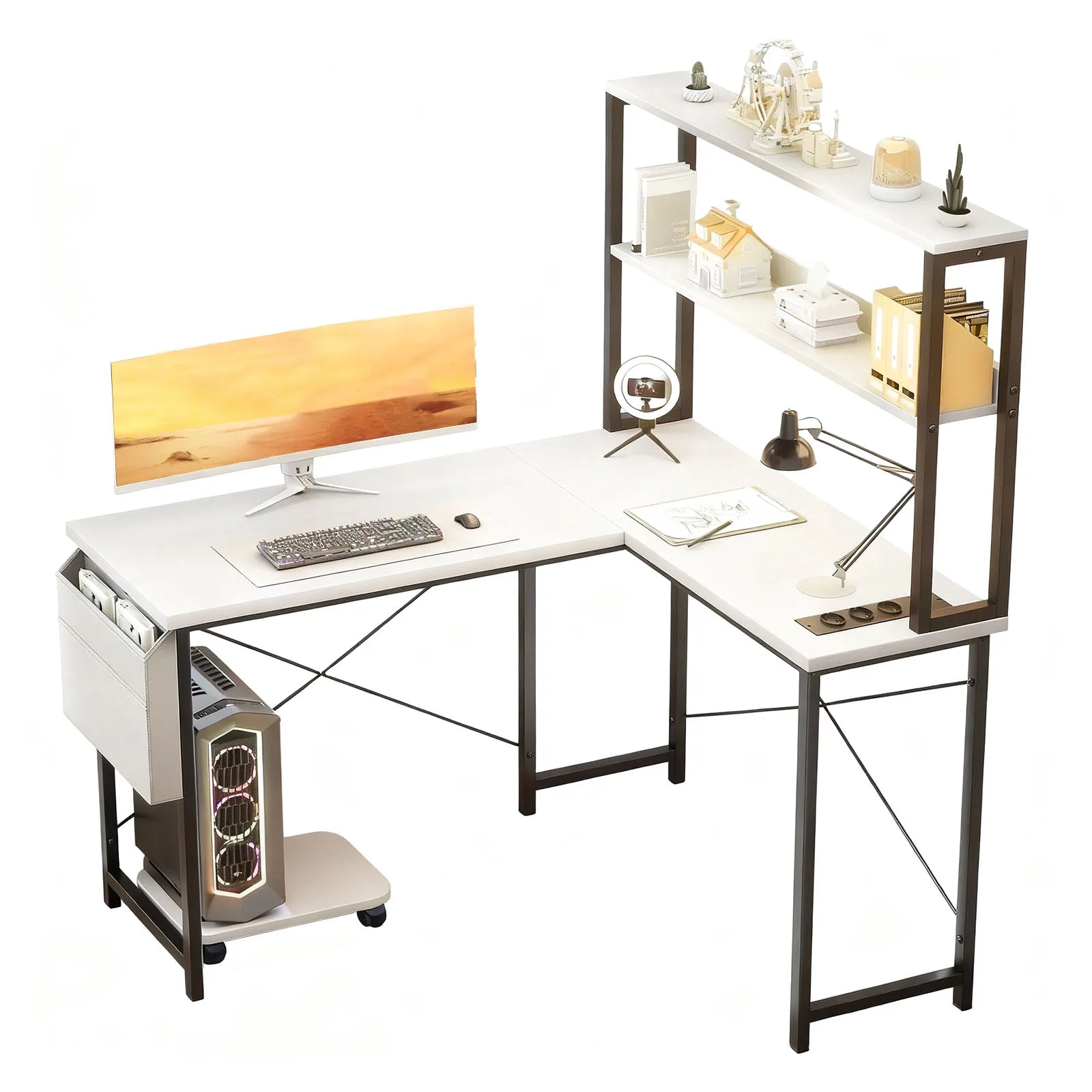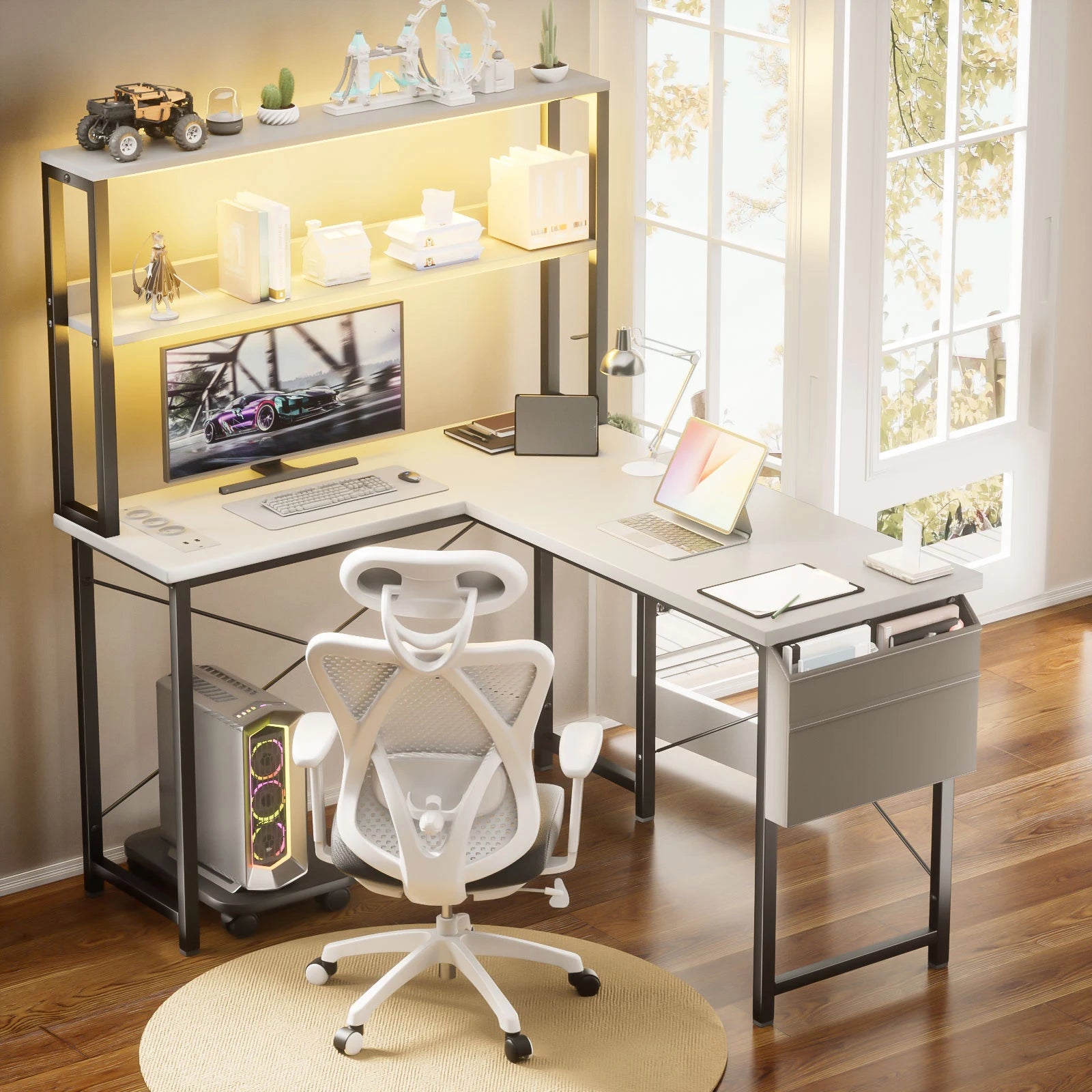 Weißer L-förmiger Schreibtisch mit LED Beleuchtung Doppelregal USB Steckdosen Gaming und Arbeitstisch