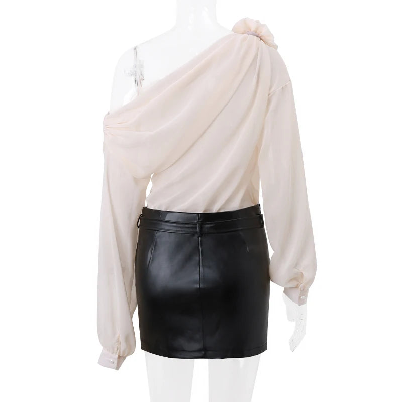 WhereMery Sexy Irregular Oblique-neck Flower Applique T Shirt Summer Off Shoulder Fashion Long Sleeve Crop Tops Street Mesh Tees
