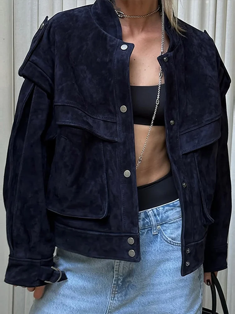 Wildleder Fleece Taschen Damen Jacken Mode Einreiher Langarm Mäntel Lose Gerade Kurze Tops Herbst Warme Kleidung