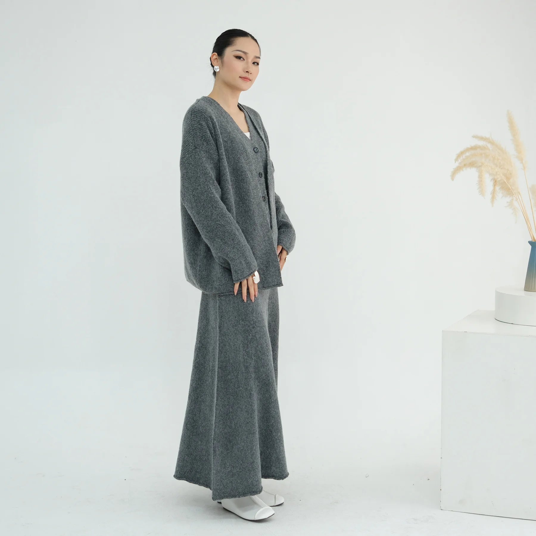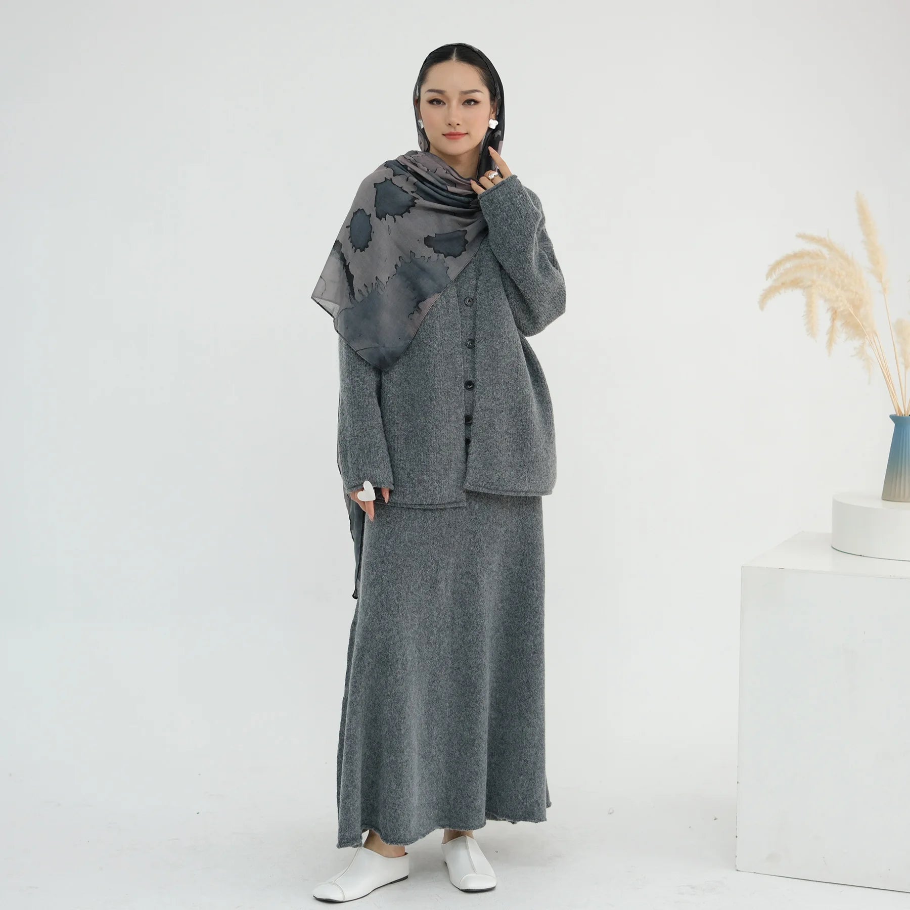 Winter Knitted Wool Cotton 3 Piece Abaya Set + Hijab Daily Thick Warm Modest Muslim Women Islamic Wholesale Suit Abaya