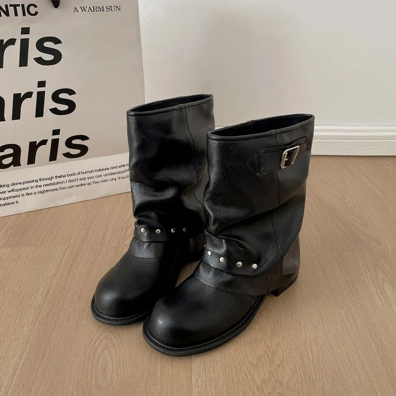 Winter Pleated Women Western Ankle Boots Fashion Rivet Belt Buckle Shoes Ladies Concise Vintage Thick Heel Short Booties