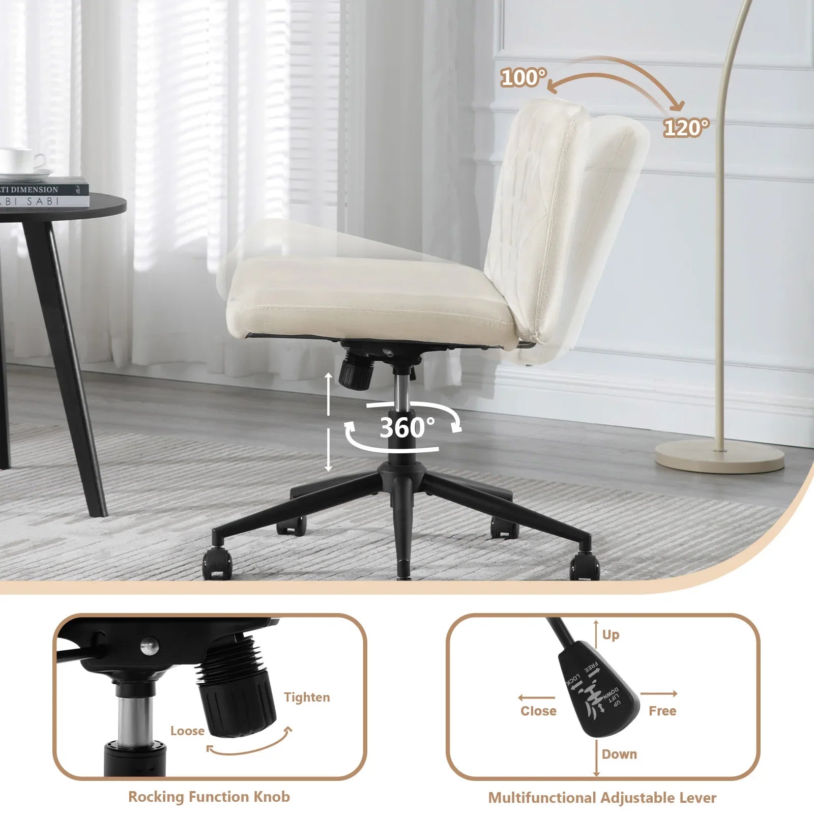 WOLTU Ergonomischer Bürostuhl aus Samt, drehbarer Rollenstuhl, Rückenlehne, gekreuzte Beine, neigbarer, höhenverstellbarer Schminkstuhl