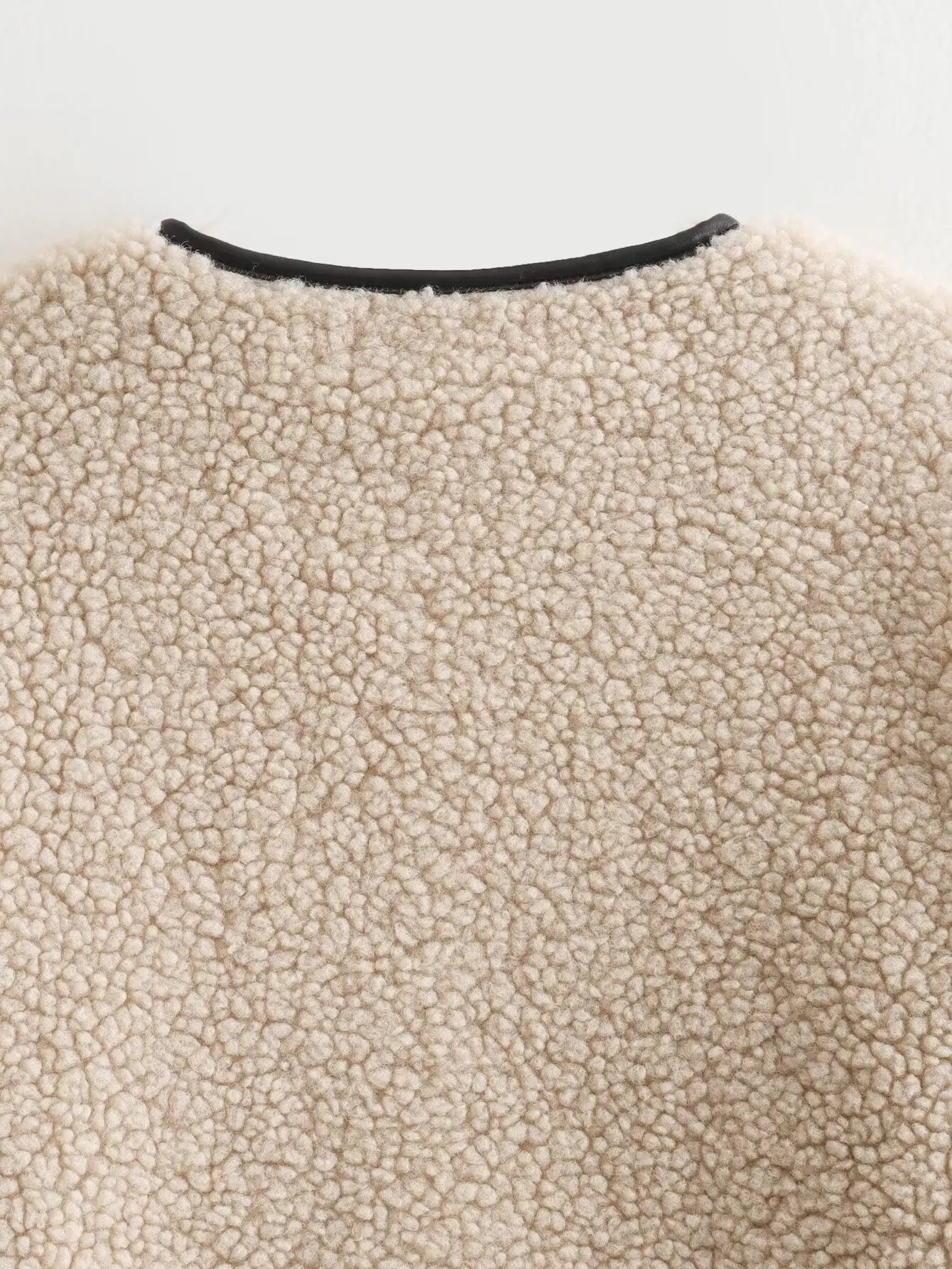 Women's Faux Wool Warm Loose Jacket Coat Retro Round Neck Single Breasted Double Pocket Casual Overcoat Winter Female Chic Coat