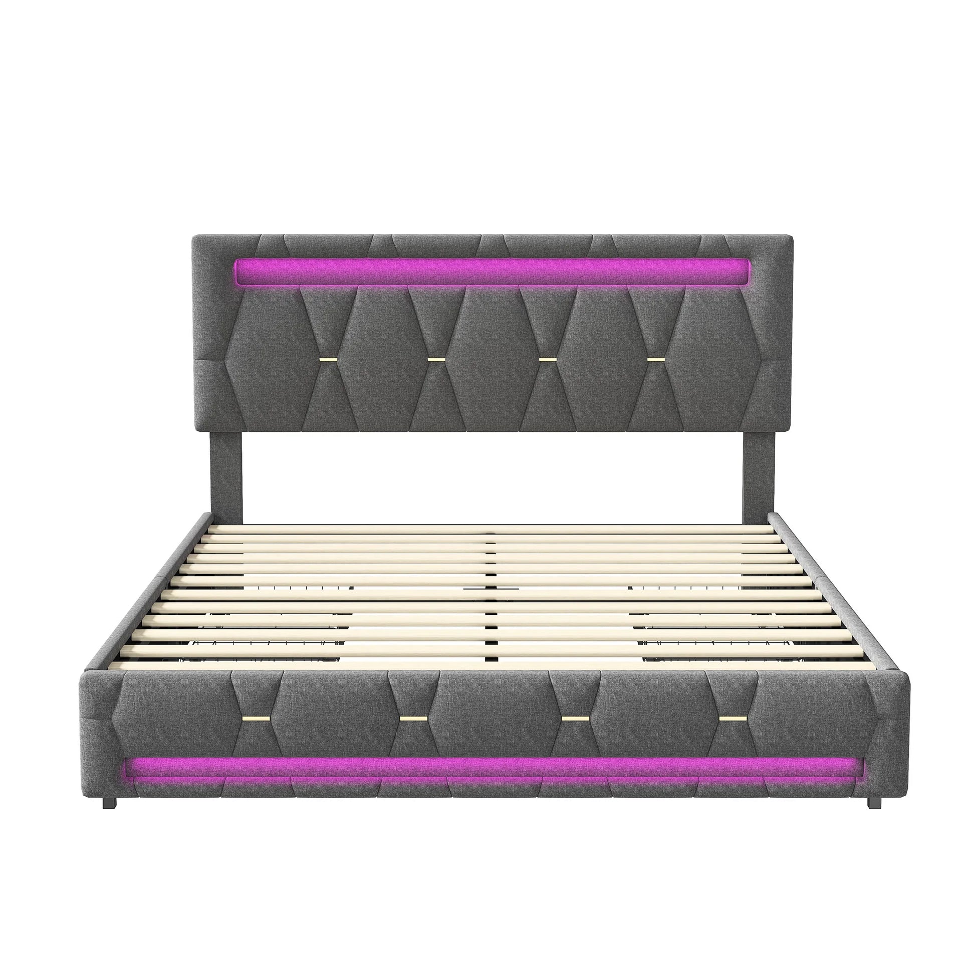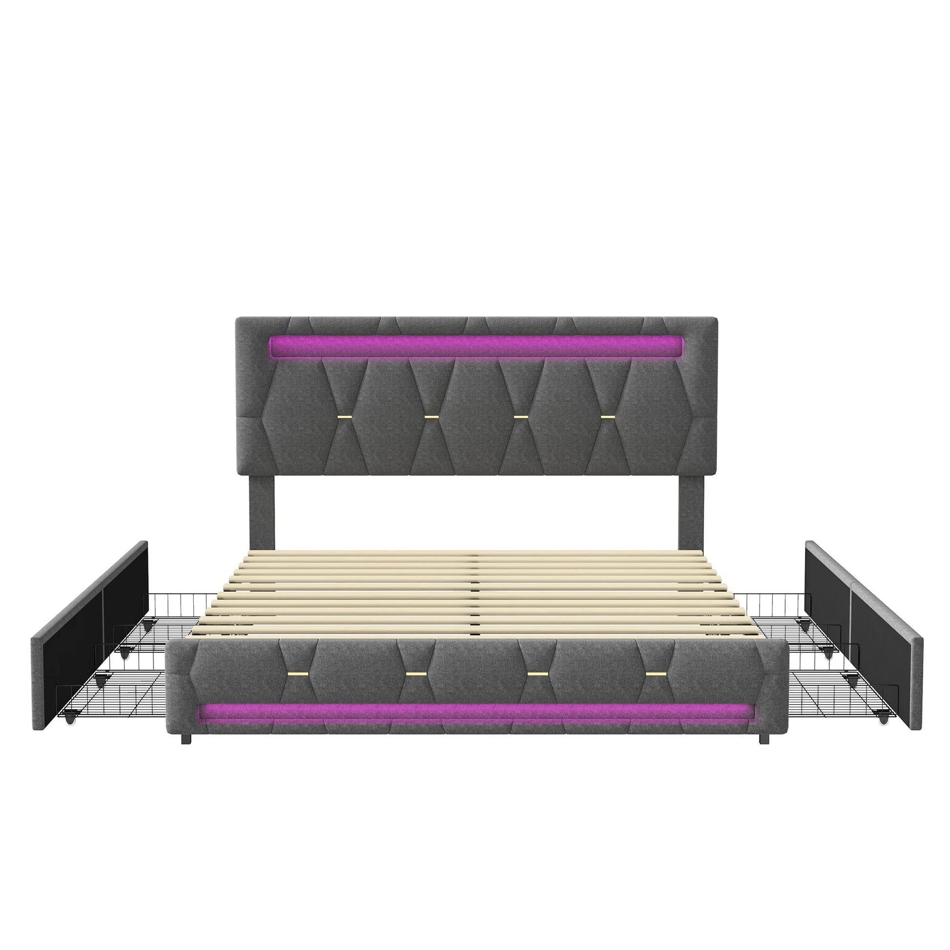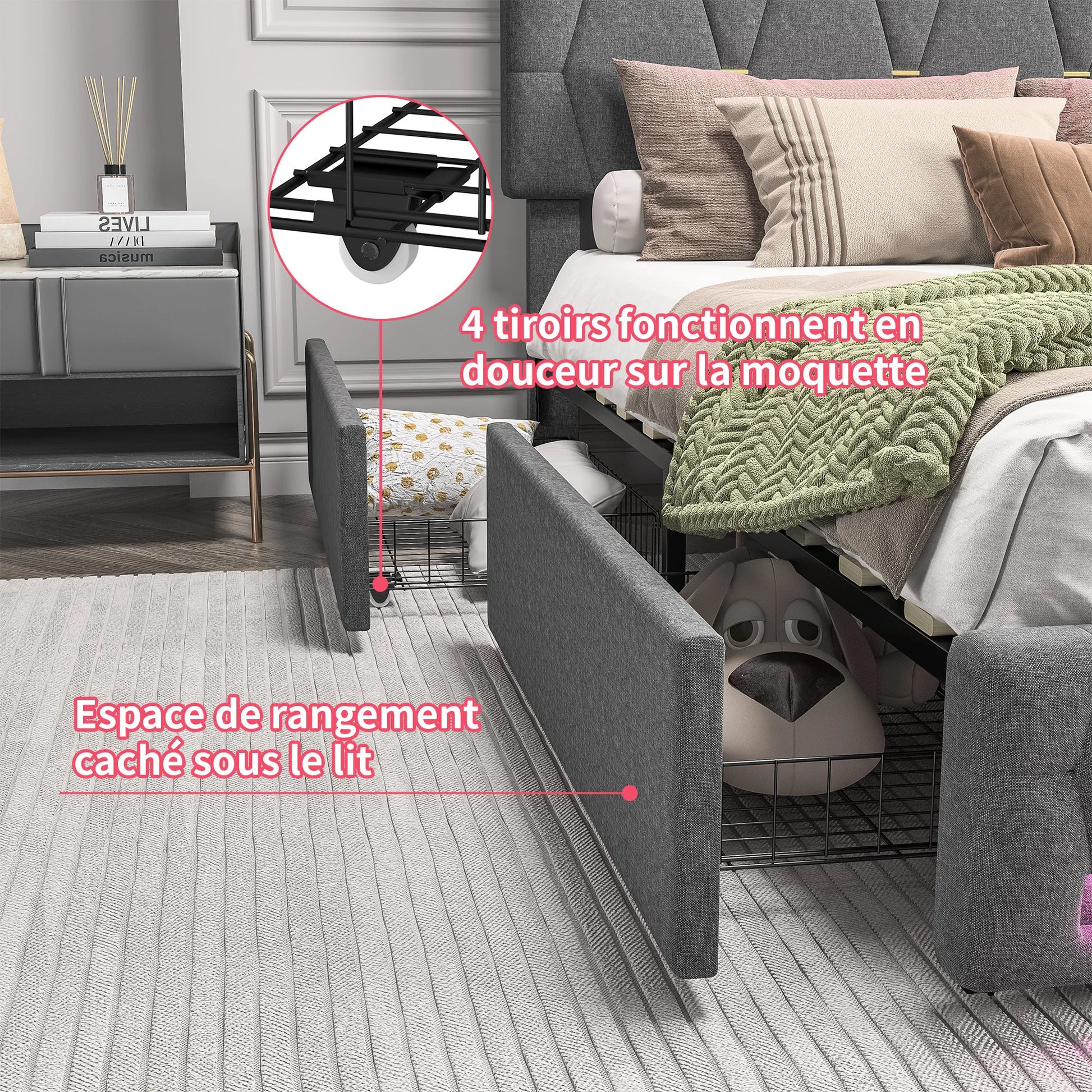 WoodenAura Bett 160x200 cm LED Doppelbett mit USB-Ladefunktion, Polsterbett Stauraumbett mit 4 Schubladen,Verstellbares Kopfteil