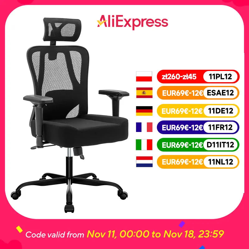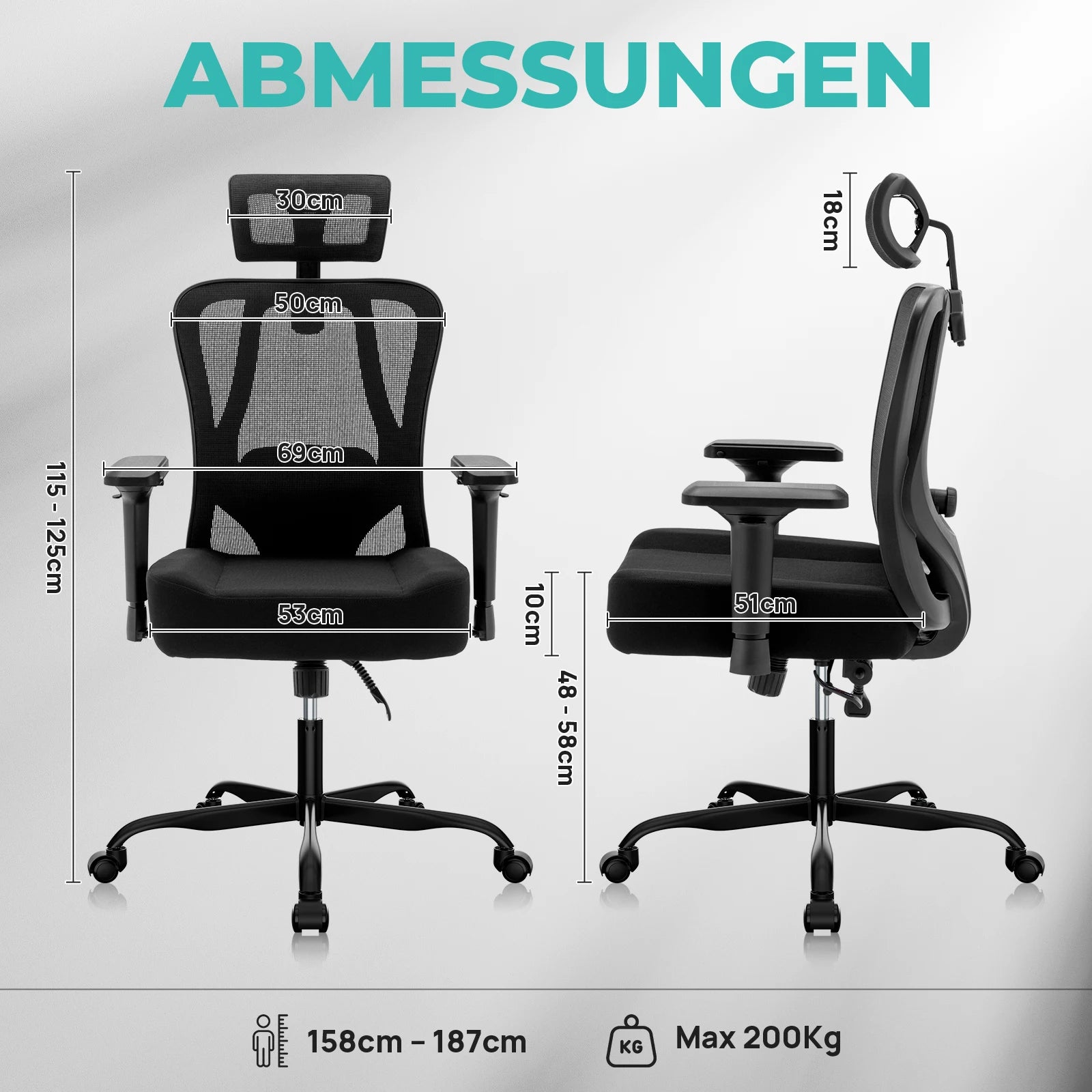 WOTSTA Ergonomischer Bürostuhl mit atmungsaktiver Rückenlehne und verstellbaren Kopfstützen-Armlehnen, gepolstertem Sitz, ideal für Arbeit und Studium