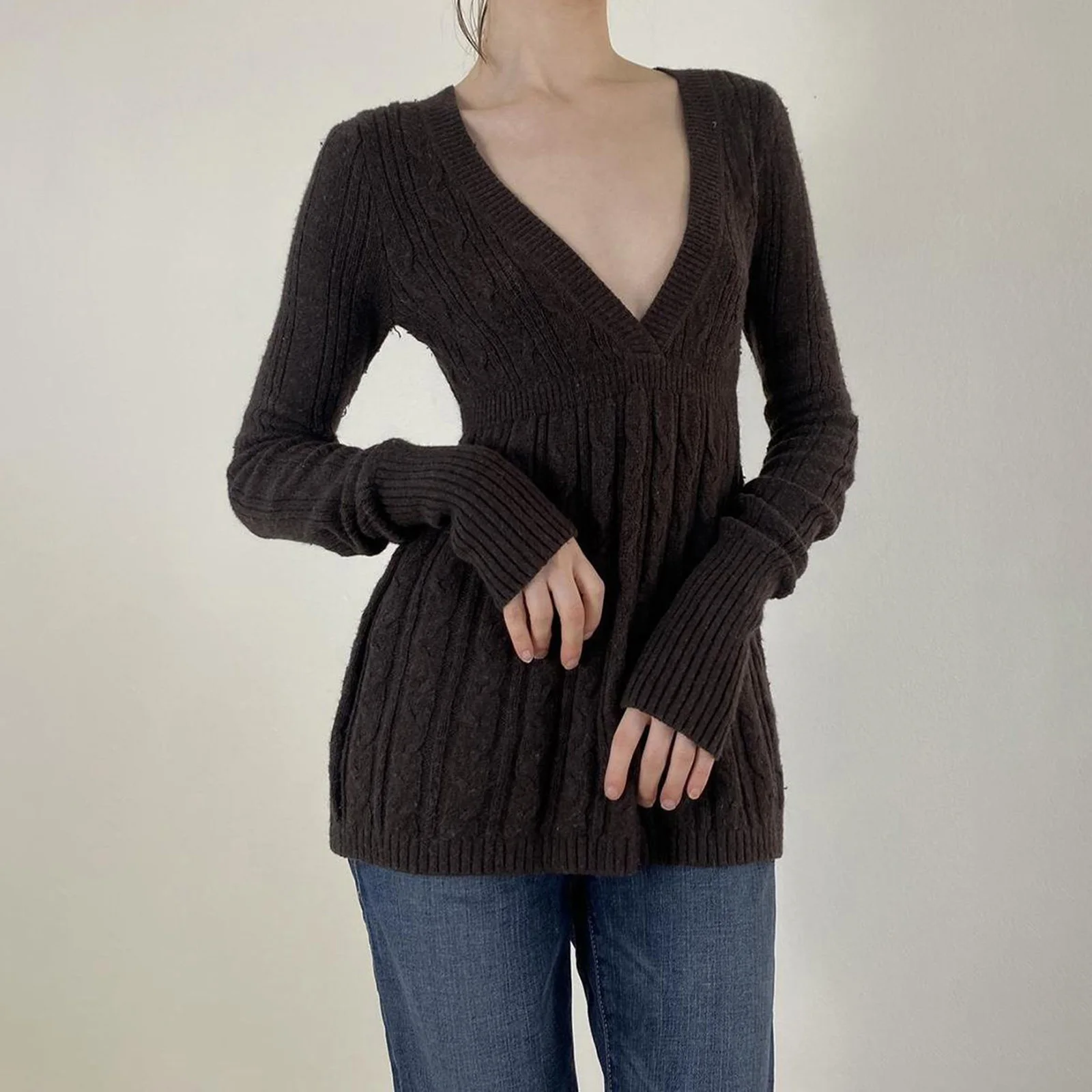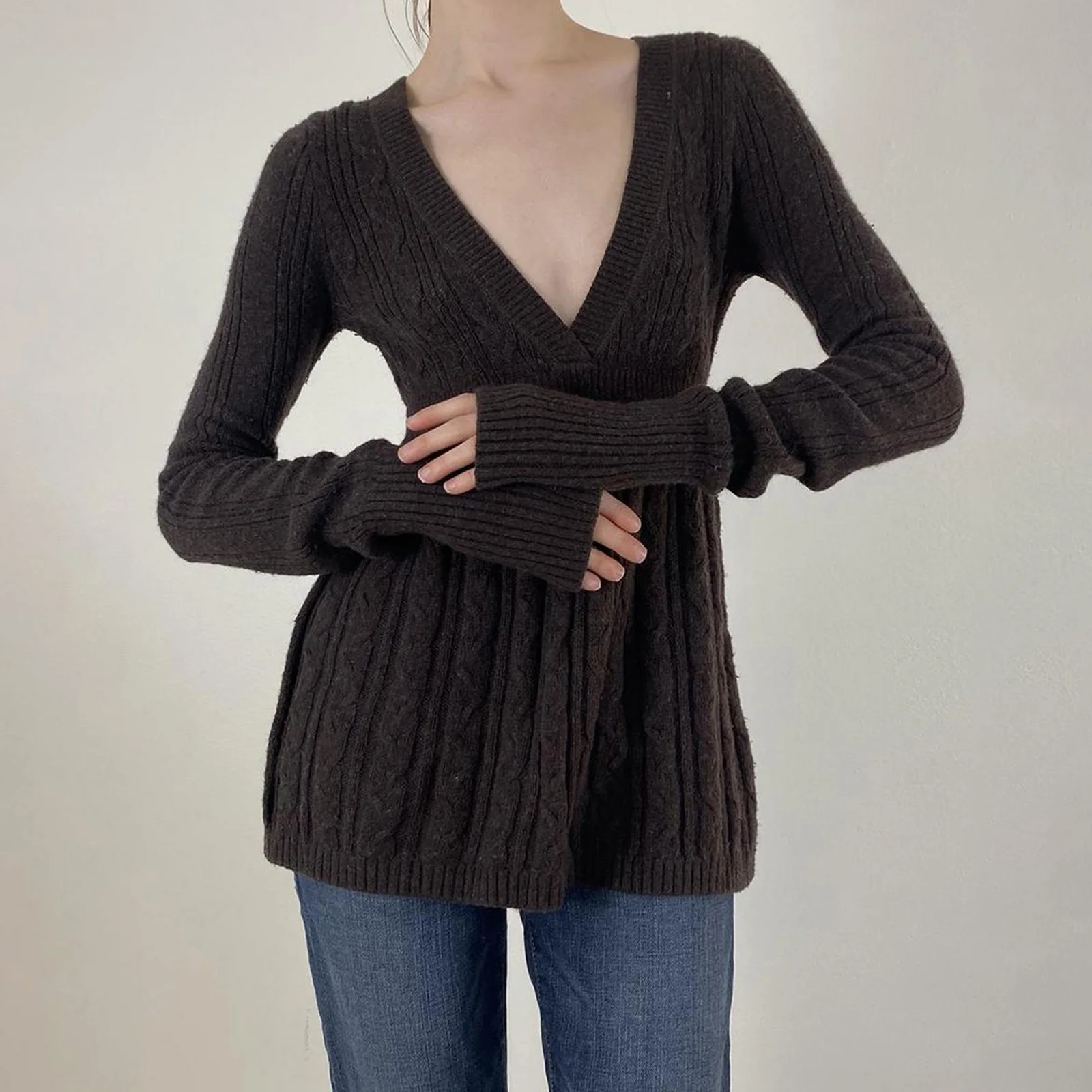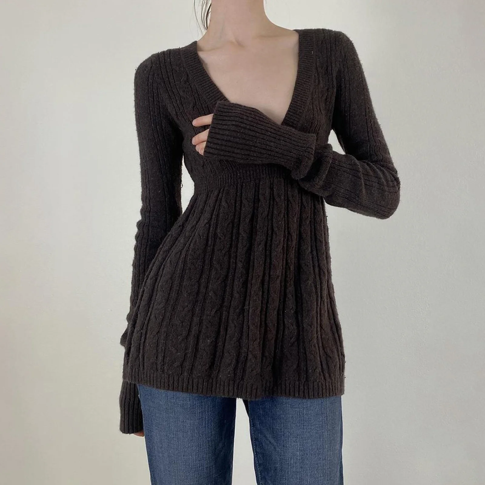 Y2K Zopfmuster-Pullover für Damen, weicher Pullover mit V-Ausschnitt, Tunika, solider A-Linien-Saum, langer Pullover, dehnbar, lässig für Herbst und Winter