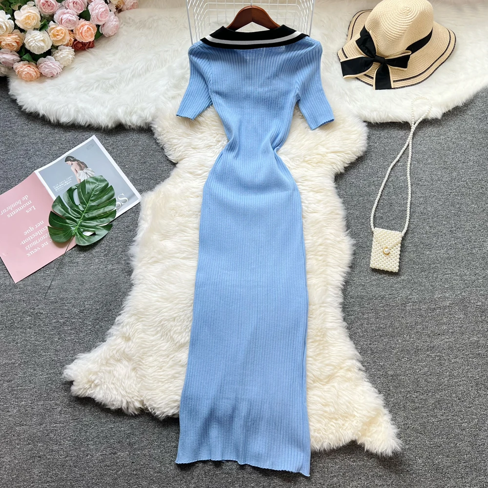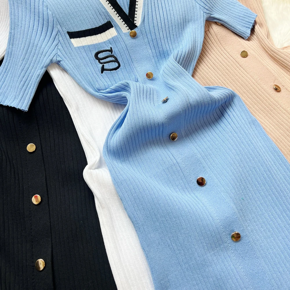 YuooMuoo 2023 Neue Sommer Frauen Gestrickte Lange Kleid Elegante Stickerei Dünne Elastische Bodycon Pullover Kleid Büro Dame Vestidos